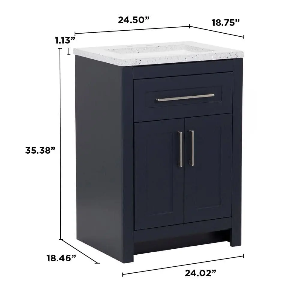 The 24.5-inch W Clady bathroom vanity in deep blue features a transitional design with inset Shaker-style doors, satin nickel hardware, and a granite-look cultured marble sink top. This freestanding vanity includes a two-door cabinet with adjustable, soft-close hinges and a below-sink drawer with three compartments for organized storage.Constructed from durable laminate furniture board, it boasts a one-piece silver ash cultured marble vanity top with an integrated rectangular white sink for a seamless appearance. The silver ash finish has a light gray base with gray, off-white, and reflective silver flecks. The single-sink top is pre-drilled for a 4-inch centerset faucet, allowing for easy style customization.Designed for quick installation around existing plumbing, this pre-assembled vanity features an open-back design, a U-shaped drawer with an adjustable front, adjustable hinges, and an unattached vanity top.
