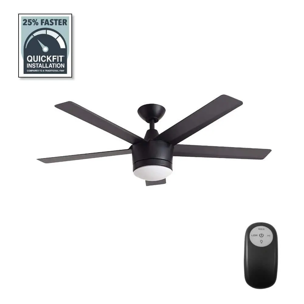 The Merwry Matte Black 52 in. ceiling fan from Home Decorators Collection is equipped with advanced technology. It comes with a fully functional handheld remote control, allowing you to adjust three speeds, reverse the fan’s direction, and control the dimming of the light. The fan's integrated 14-Watt LED provides efficient, long-lasting illumination.