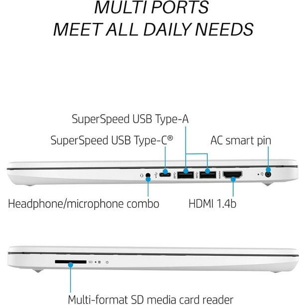 The HP 14-inch Laptop combines sleek design, reliable performance, and long-lasting battery life for everyday tasks. Its thin and light design, with a 6.5mm micro-edge bezel display, offers an impressive 79% screen-to-body ratio to enhance productivity while being portable enough to take anywhere.