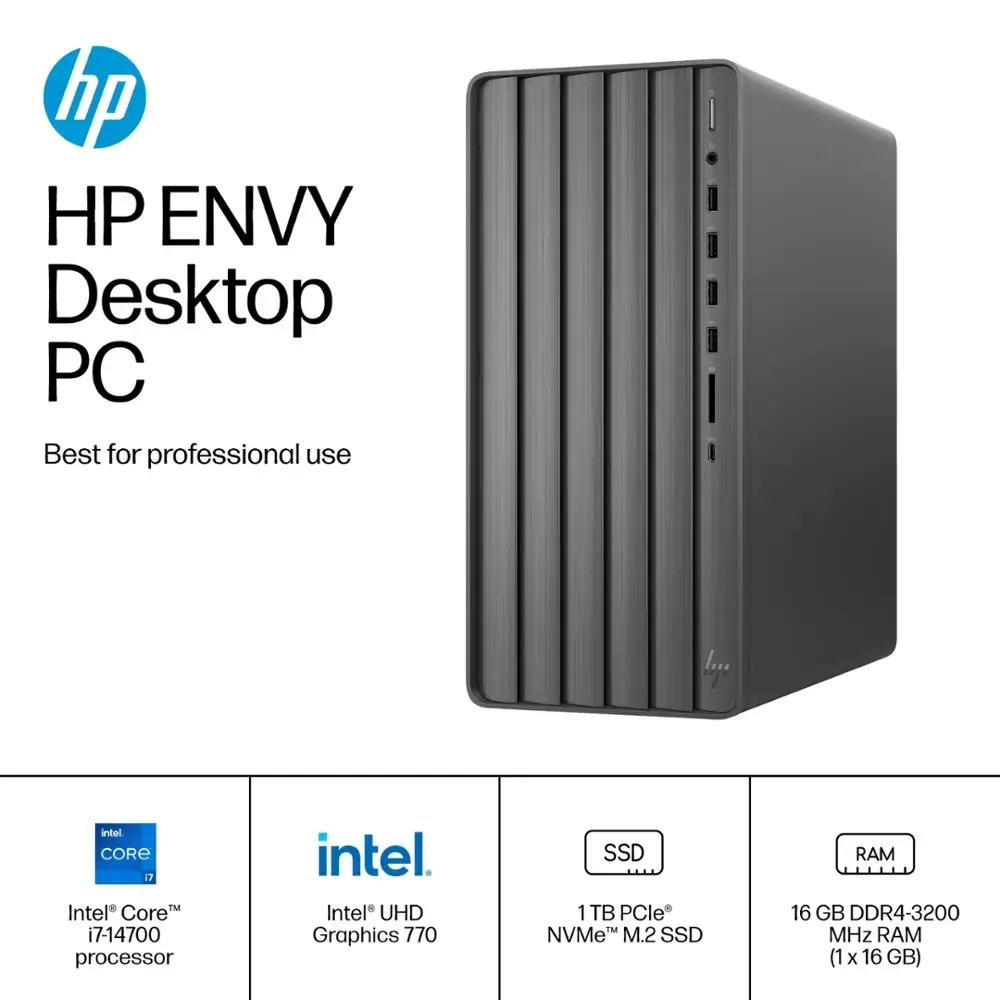 Unleash your creativity with the HP Envy Desktop, engineered for power, speed, and efficiency. Whether you're editing, rendering, or streaming, this PC delivers exceptional performance with an Intel Core i7 14th Gen processor and NVIDIA GeForce RTX graphics. Featuring ample storage, immersive audio, and the latest connectivity options, the HP Envy is built to enhance both work and play.