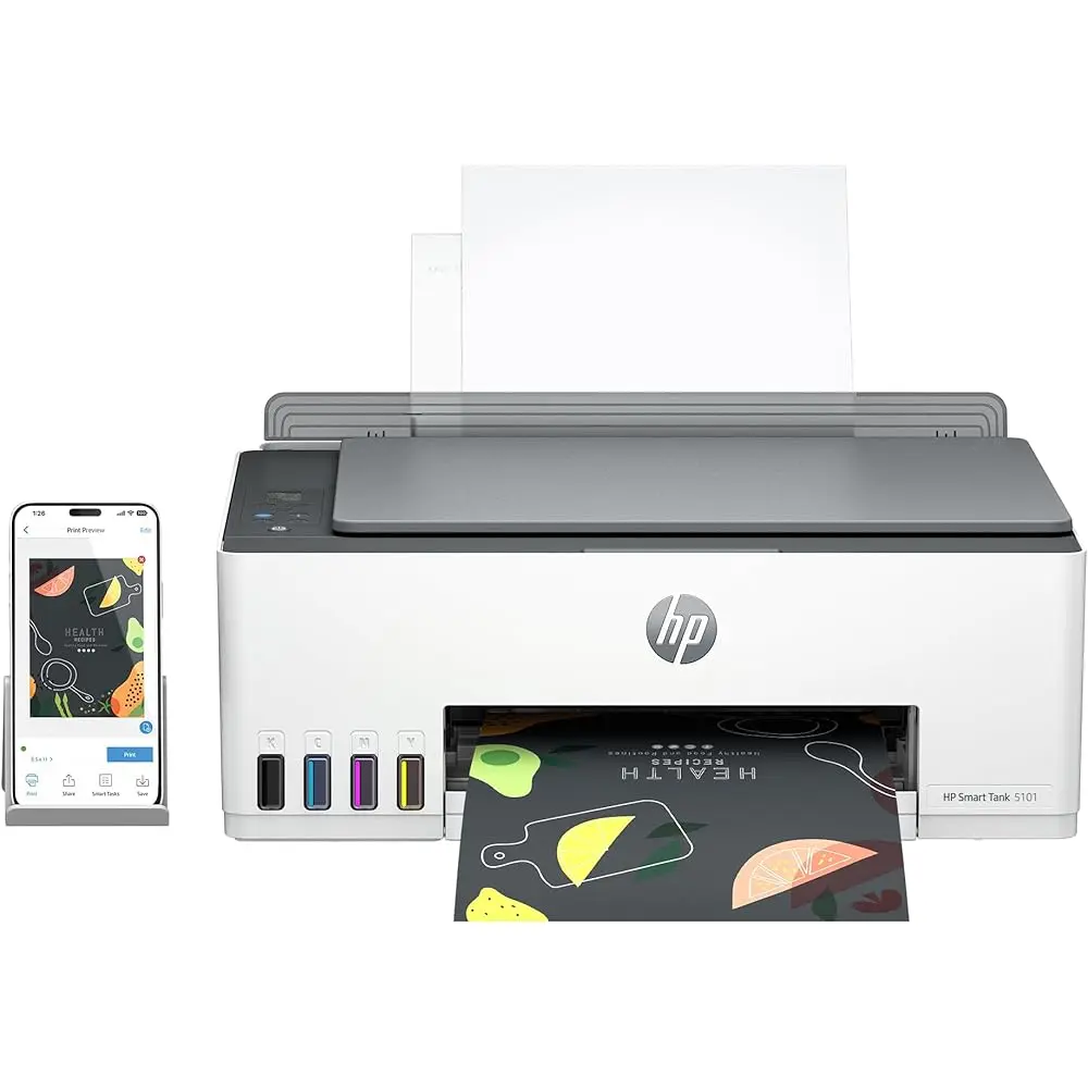 The HP Smart Tank 5101 Wireless All-in-One Ink Tank Printer is the ultimate solution for home printing needs, combining affordability with high performance. This printer is designed to handle all your printing, scanning, and copying tasks with ease. Featuring a refillable ink tank system, it offers a cost-effective printing experience, reducing the need for frequent cartridge replacements.