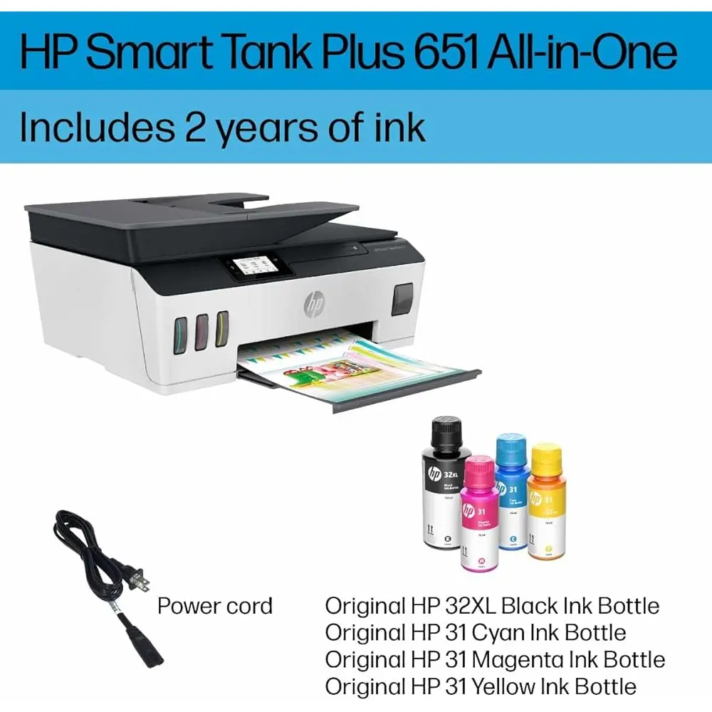 The HP Smart Tank Plus 651 Wireless All-in-One Ink-Tank Printer is designed to meet all your home or office printing needs with exceptional value. This printer provides up to 2 years of ink in bottles, making it an economical and low-maintenance solution for high-volume printing. Whether you need to print, scan, or copy, this versatile device ensures quality results across all tasks.