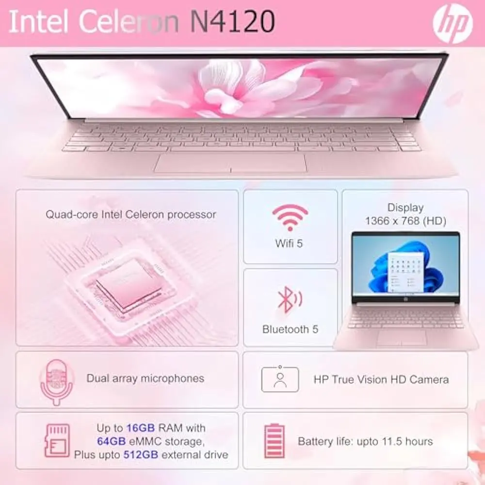 The HP Ultralight 14" Laptop is a sleek and portable device designed for everyday productivity. Featuring a 14-inch HD display (1366 x 768 pixels), it delivers clear visuals in a compact 0.71-inch slim design. Powered by an Intel 4-Core Celeron processor (1.1 GHz) and 16GB DDR4 RAM, it ensures smooth multitasking and efficient performance.
