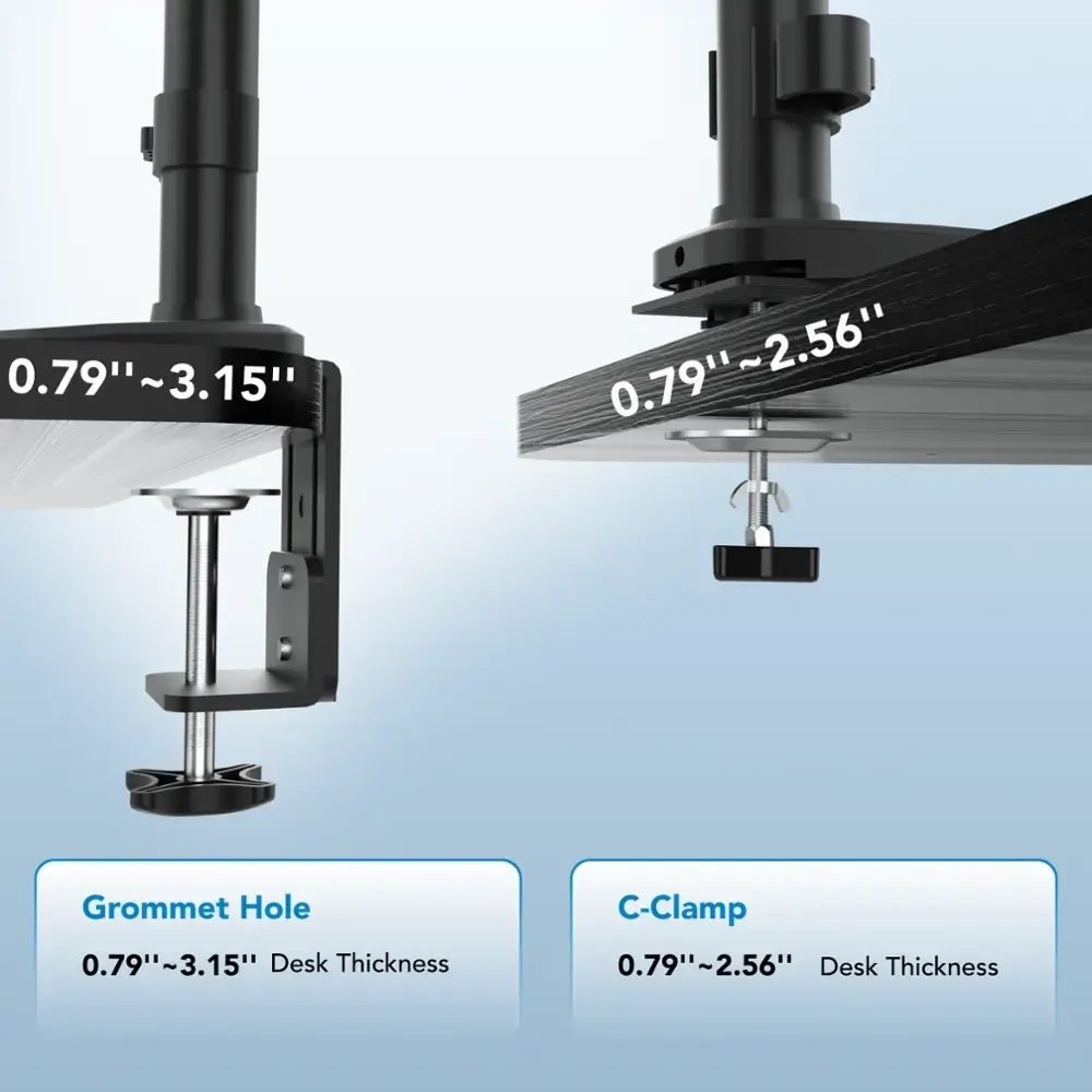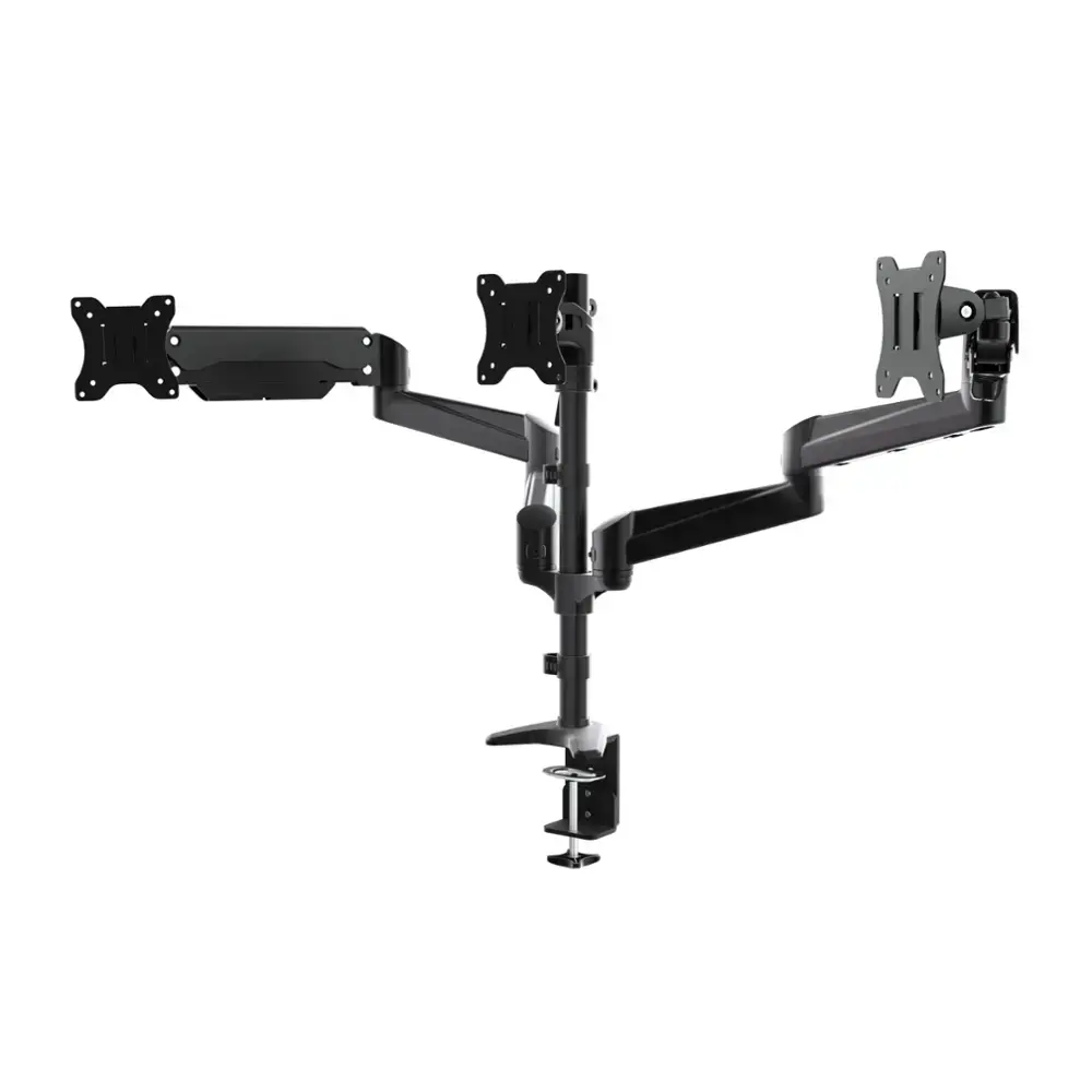 The HNTS8B is a triple monitor desk mount designed for 13-32″ monitors, supporting up to 17.6 lbs. Its gas spring arms make height adjustments effortless – just move the monitors to your preferred position without needing any tools! The sturdy pillar provides extended height adjustments, while height, swivel, and tilt options ensure the monitors are positioned for the best viewing angles. It offers versatile mounting options, including desk clamp or grommet mounts, suitable for different desk types. The integrated cable management system keeps cables neatly organized for a tidy workspace.