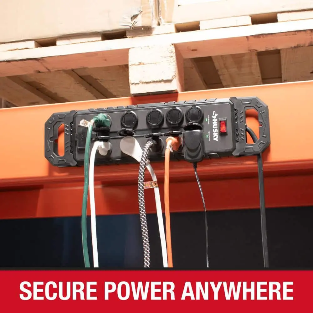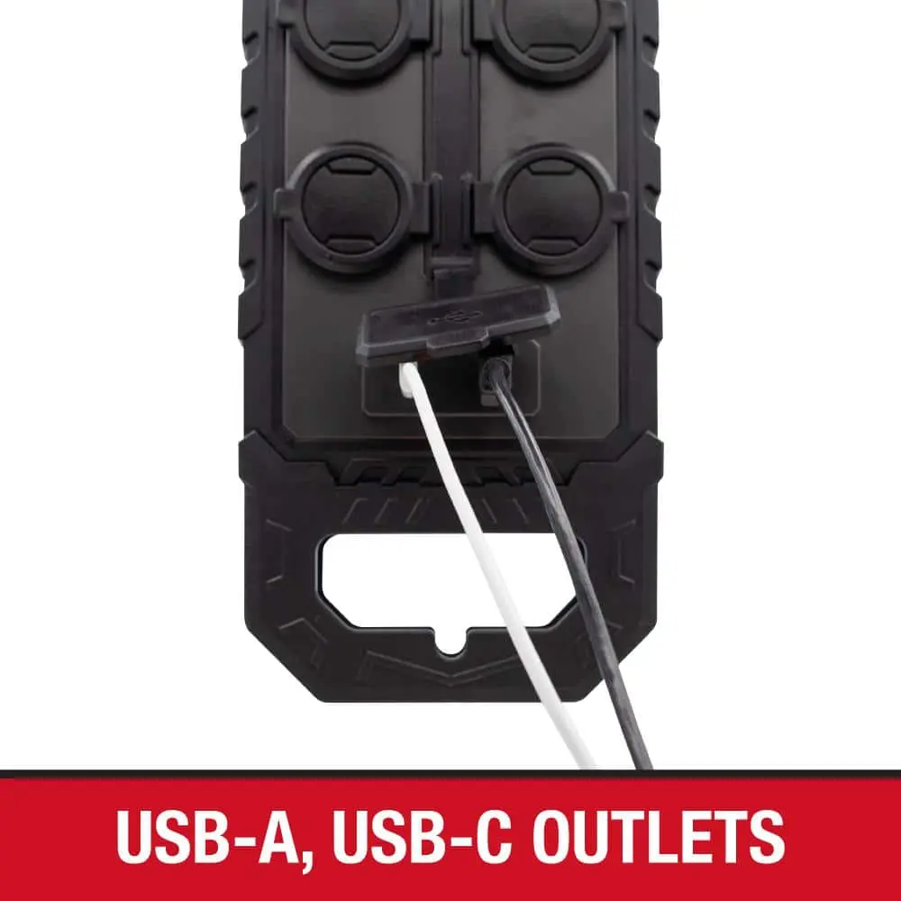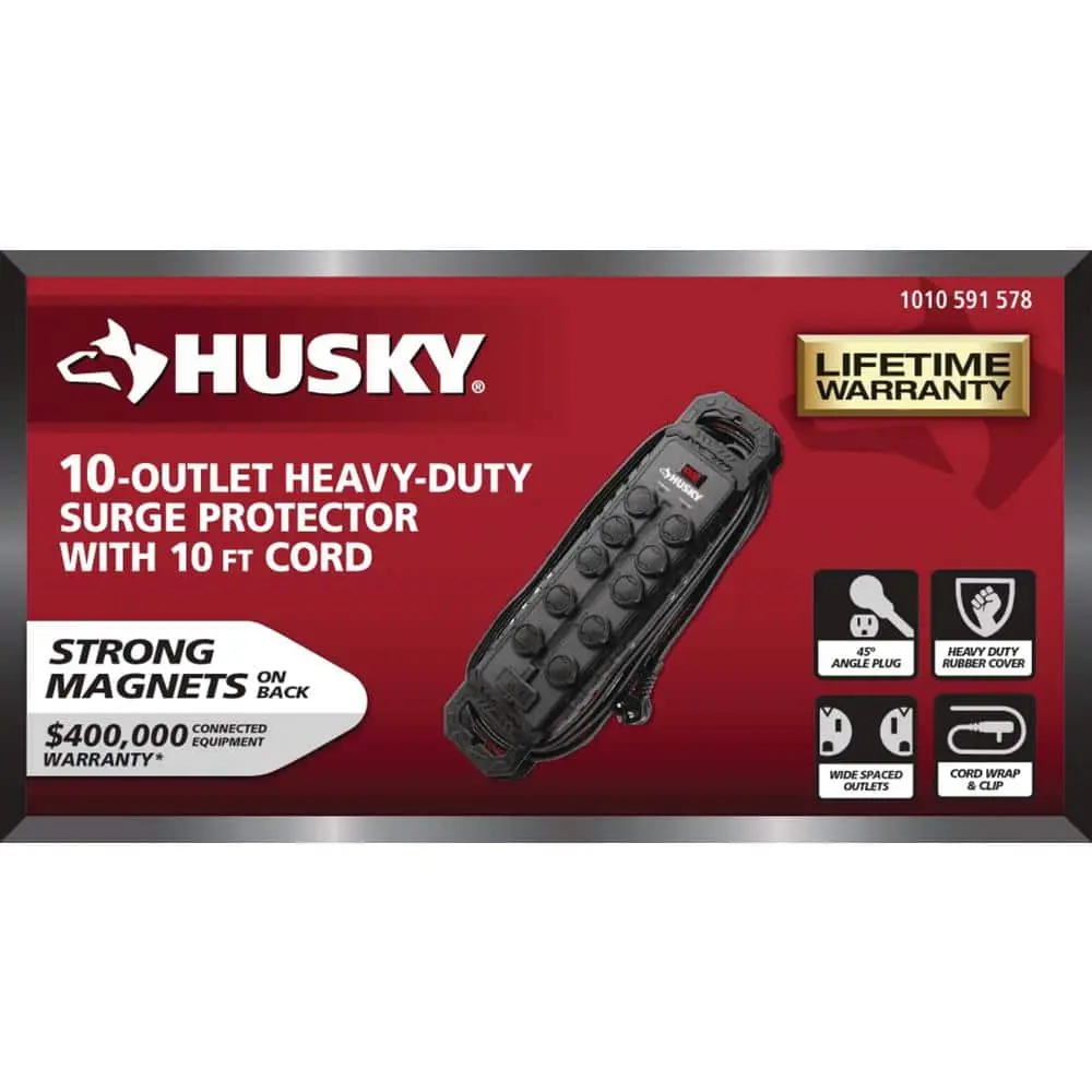 The Husky 10 ft. 14/3 Heavy-Duty 10-Outlet Surge Protector with USB-A and USB-C connections is perfect for powering tools and electronic devices in your garage or workshop. Built with durable rubber covers and a thick bumper, it’s designed for heavy-duty use. The 10 ft. cord with a right-angle plug provides extended reach and helps prevent outlet overcrowding.
