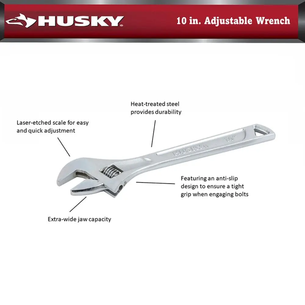 The Husky 10 in. Adjustable Wrench offers versatility and durability for a wide range of tasks. With its 10-inch adjustable wrench, it can easily fit various fastener sizes. The adjustable jaw ensures flexibility, while the durable construction guarantees long-lasting performance. The ergonomic handle provides a comfortable and secure grip, making it perfect for plumbing, automotive, and general repair tasks