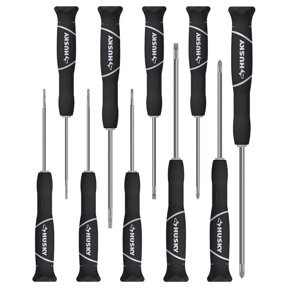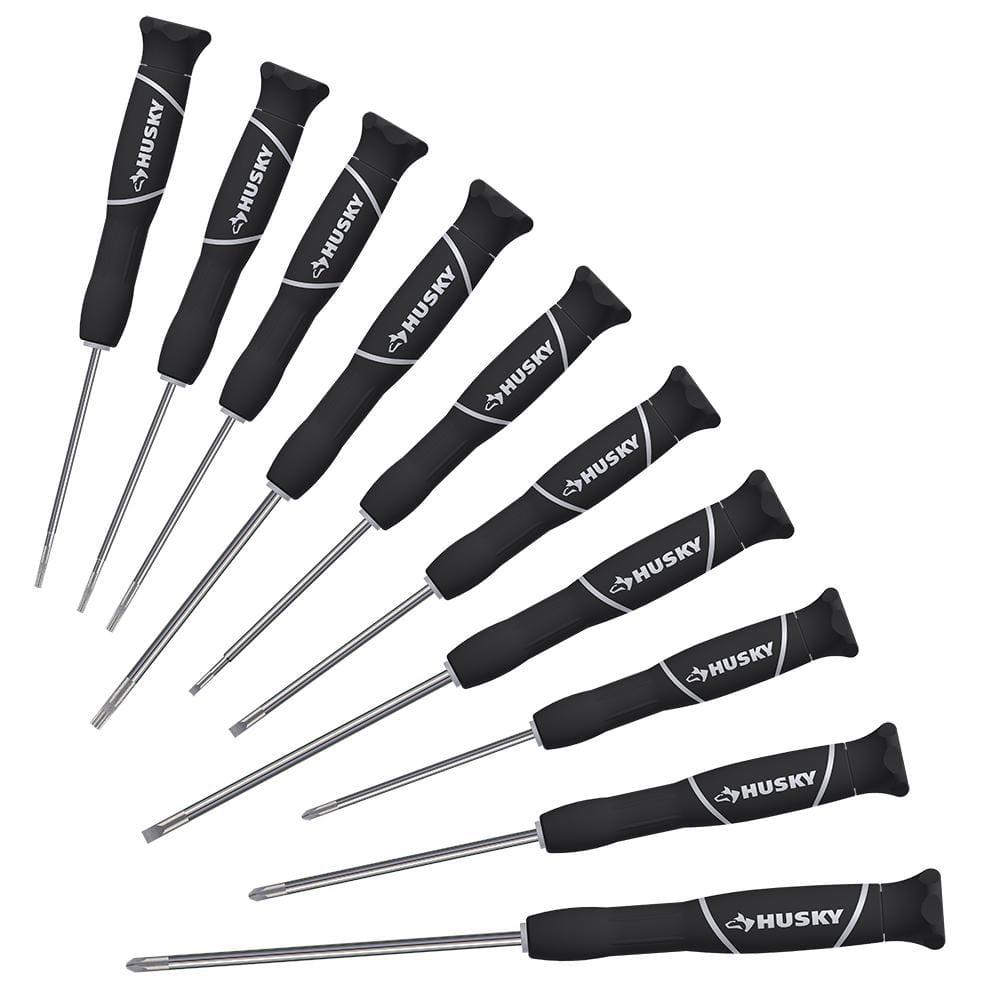 The Husky 10-Piece Precision Screwdriver Set includes precision slotted 1/16 in., 3/32 in., 1/8 in. screwdrivers, precision Philips #00, #0, and #1 screwdrivers, and TORX T6, T7, T8, T9 for your precision work. The handle is designed to provide greater handle torque and more comfort. The unique dual-material handle removes grip slippage during high-torque applications. The tip size marking is laser etched on the rotating cap for easy identification and longevity. The alloy-steel blade is heat treated for strength, with a precision-formed tip for an accurate fit and limited cam-out. The extended reach design and longer shanks deliver improved visibility and reach. The rotating caps offer greater control and turning. Chrome-plated shanks provide superior rust protection.