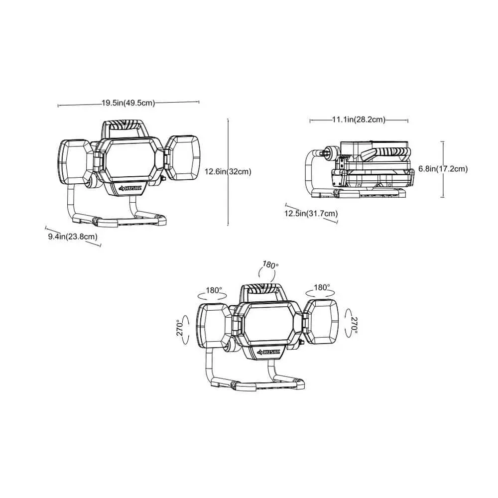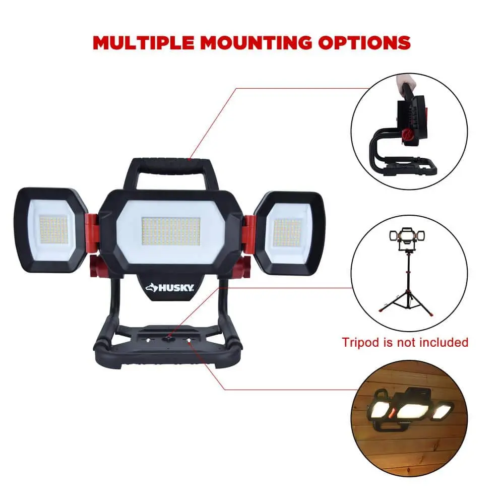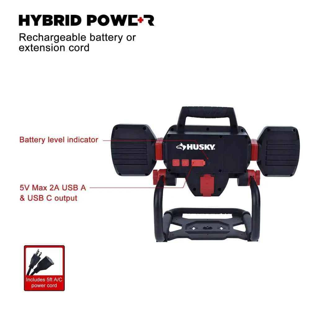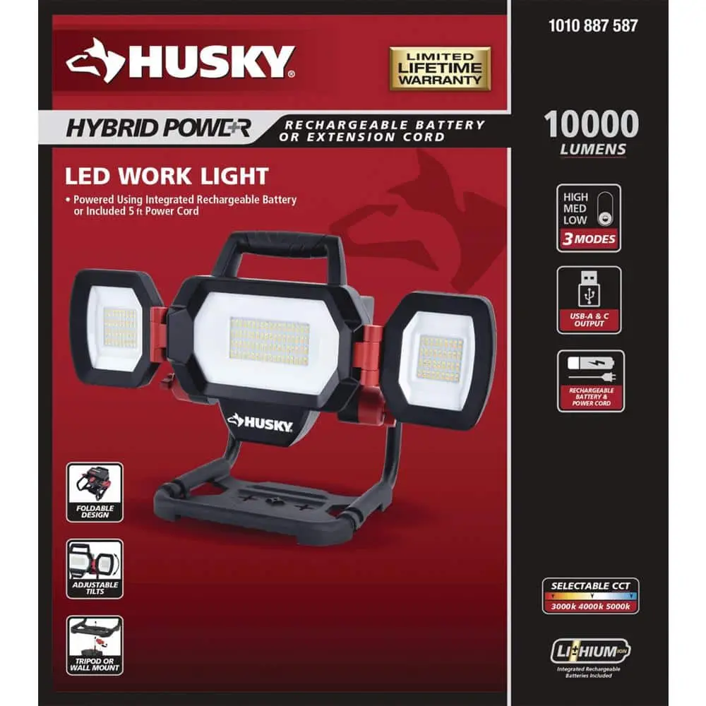 This high-intensity, dual-power LED work light is designed for maximum versatility. It operates both on its integrated lithium-ion battery and through an AC extension cord for continuous power. The rechargeable battery provides up to 10 hours of cordless runtime, and the power indicator lets you know when it's time to recharge. Once the battery is depleted, simply plug in the included 5ft AC power cord and keep working without interruption. Built with durable, die-cast aluminum, this light is both strong and reliable. It features two adjustable side lights that pivot 180° and 270°, with the main light supporting 180° vertical rotation. Choose from three selectable color temperatures (CCT) – 3000K, 4000K, and 5000K – to suit any project. With up to 10,000 lumens under AC power and 4,000 lumens on DC, it’s perfect for everything from auto repair to construction. Additionally, the light is foldable, easy to carry with its grip handle, and offers USB-A and USB-C outputs for charging portable devices.