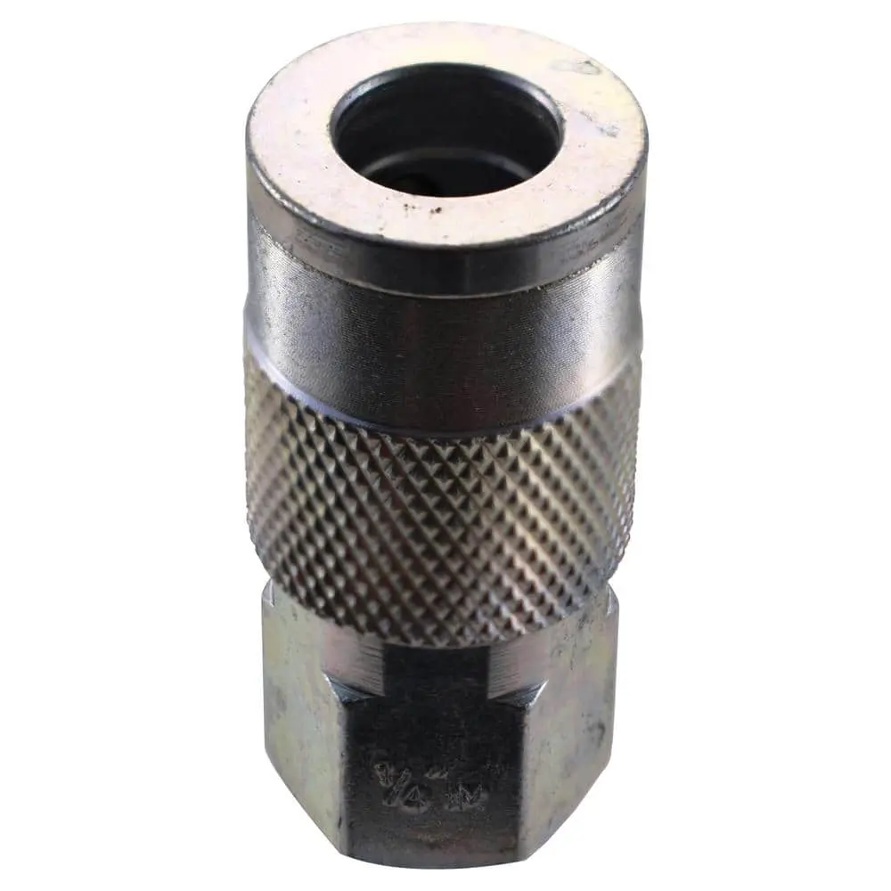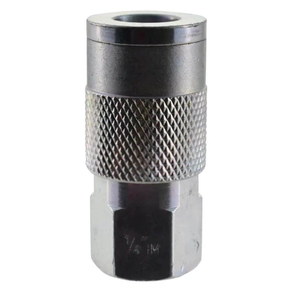 The Husky 1/4 in. x 1/4 in. NPT Female Industrial Steel Coupler simplifies tool connections with its durable, corrosion-resistant zinc-plated steel body. Designed for reliability, it features both a 1/4 in. snap-in and a 1/4 in. screw-on fitting, making it a great addition to any workshop.