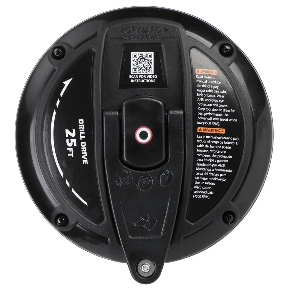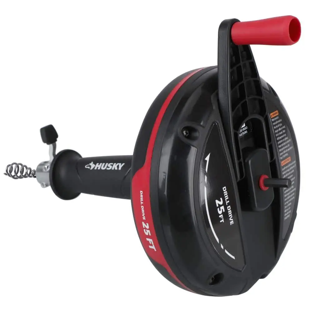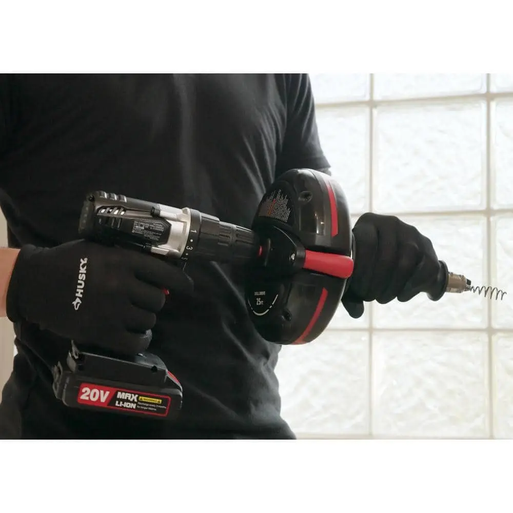 The Husky 1/4 in. x 25 ft. Power Drum Auger is designed for clearing clogs in most sink, shower, and tub drains. It can be used manually or with a drill attachment (drill not included) for extra power. Featuring a center-balanced pistol grip, this auger provides enhanced control and comfortable operation. The quick-release cable lock allows for fast and secure adjustments, making it an effective solution for stubborn drain clogs.
