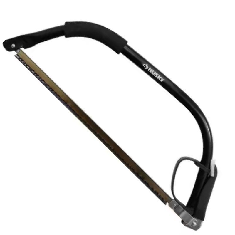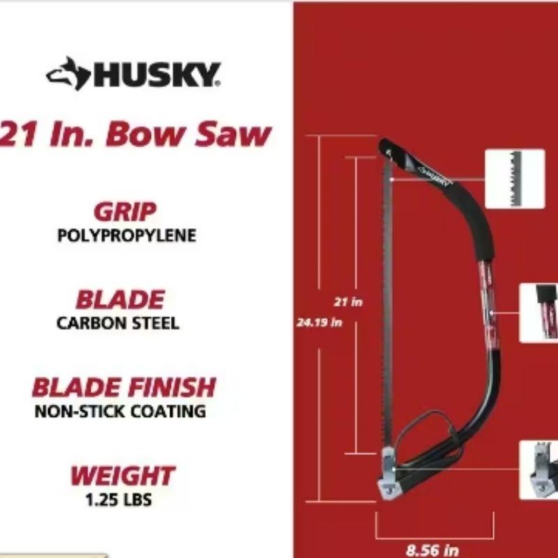 The Husky 21 in. Bow Saw is a durable cutting tool with a 21-inch blade, designed for medium to large branches and logs. It features a high-tension steel frame for strength, an ergonomic non-slip handle for comfort, and an adjustable blade tension mechanism. Ideal for pruning, firewood cutting, and clearing, it offers a balance of efficiency and ease of use. Dimensions Blade Length (in.):21 in Handle Length (in.):6.5 in Product Depth (in.):1.13 in Product Height (in.):8.56 in Product Width (in.):24.19 in Details Blade Material:High Carbon Steel Features:Tempered Blade Garden Tool Handle Style:Ergonomic Handle Material:Steel Maximum Cutting Thickness (in.):7 in Product Weight (lb.):1.25 lb Saw Type:Bow Saw