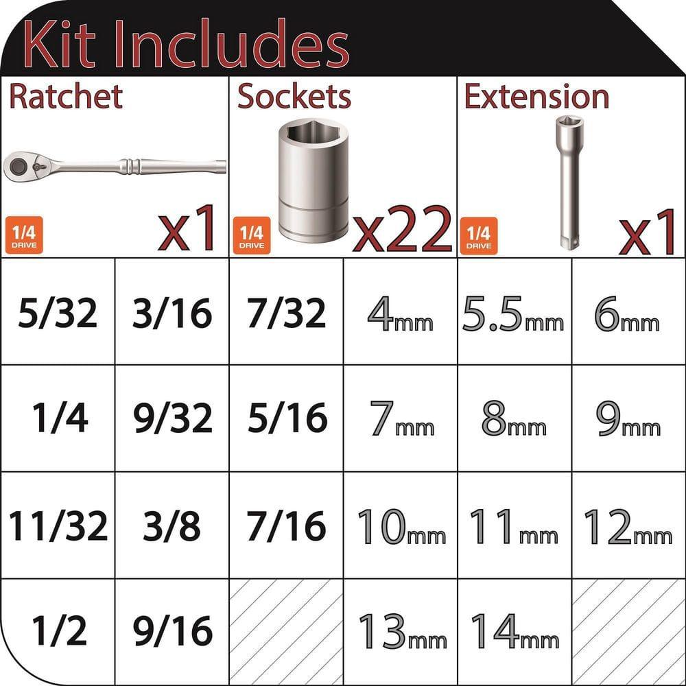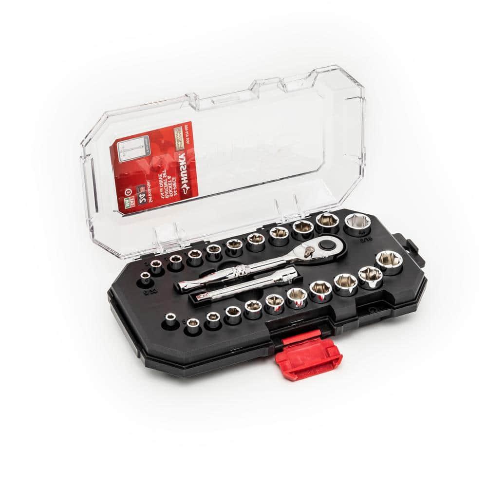 Introducing the Husky 24-piece 1/4-inch drive socket wrench set, crafted from chrome alloy steel for unbeatable durability and strength. Embracing 22 different sockets, this versatile set is tailored to handle a wide array of basic fastening and repair projects. Perfect for garages and home workshops, this set guarantees the reliability and performance needed for tackling various tasks with ease and confidence.