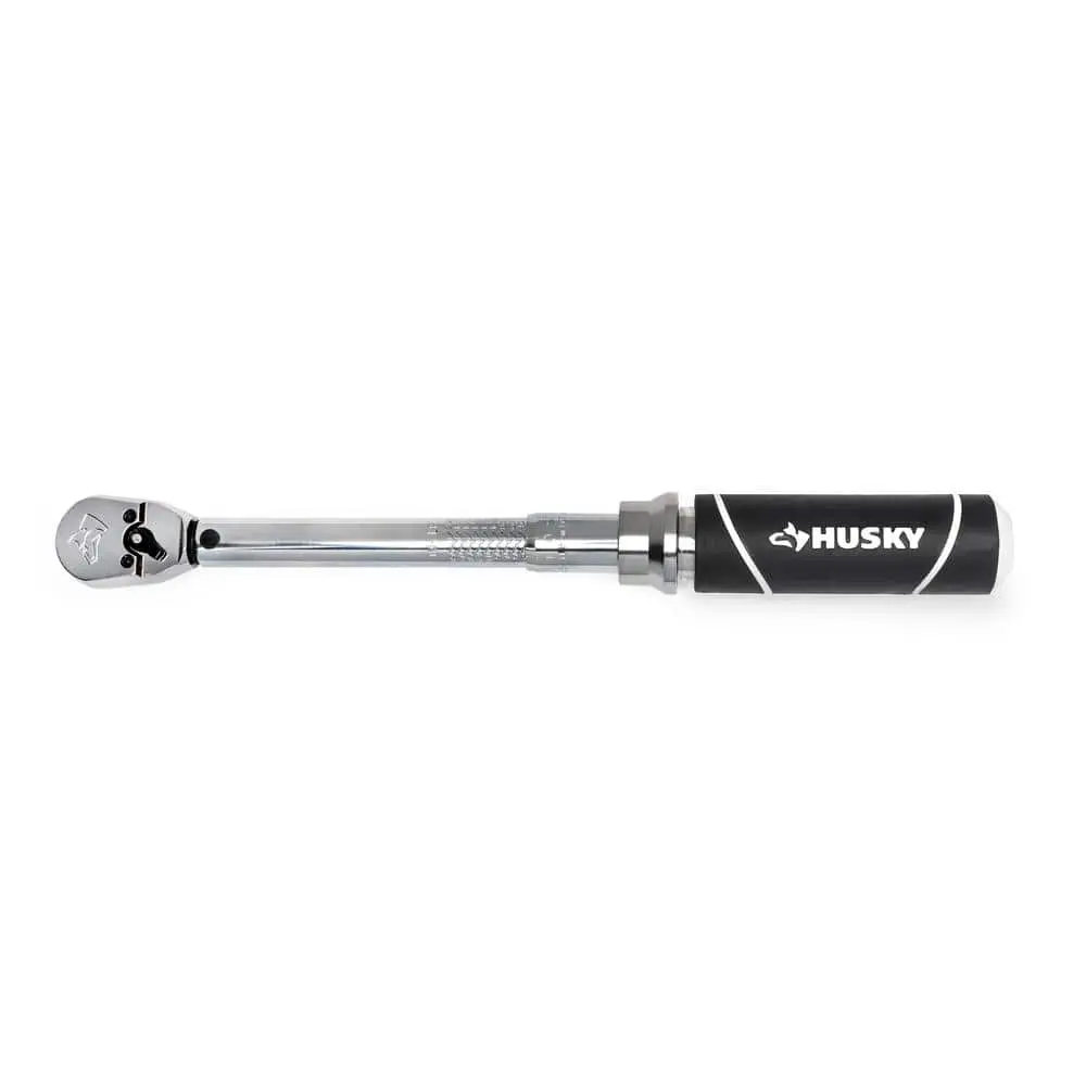 The Husky 40 in./lbs. to 200 in./lbs. 1/4 in. Drive Torque Wrench offers a versatile adjustable torque range from 40 in./lbs. to 200 in./lbs., making it ideal for a variety of applications. The 1/4-inch drive is compatible with standard 1/4-inch drive sockets. Its durable construction ensures long-lasting reliability, while the easy-to-read scale provides accurate torque settings. The click mechanism gives audible and tactile feedback when the desired torque is reached. Designed with a comfortable handle, it offers a secure grip for ease of use, and its precise calibration ensures consistent and reliable torque application every time