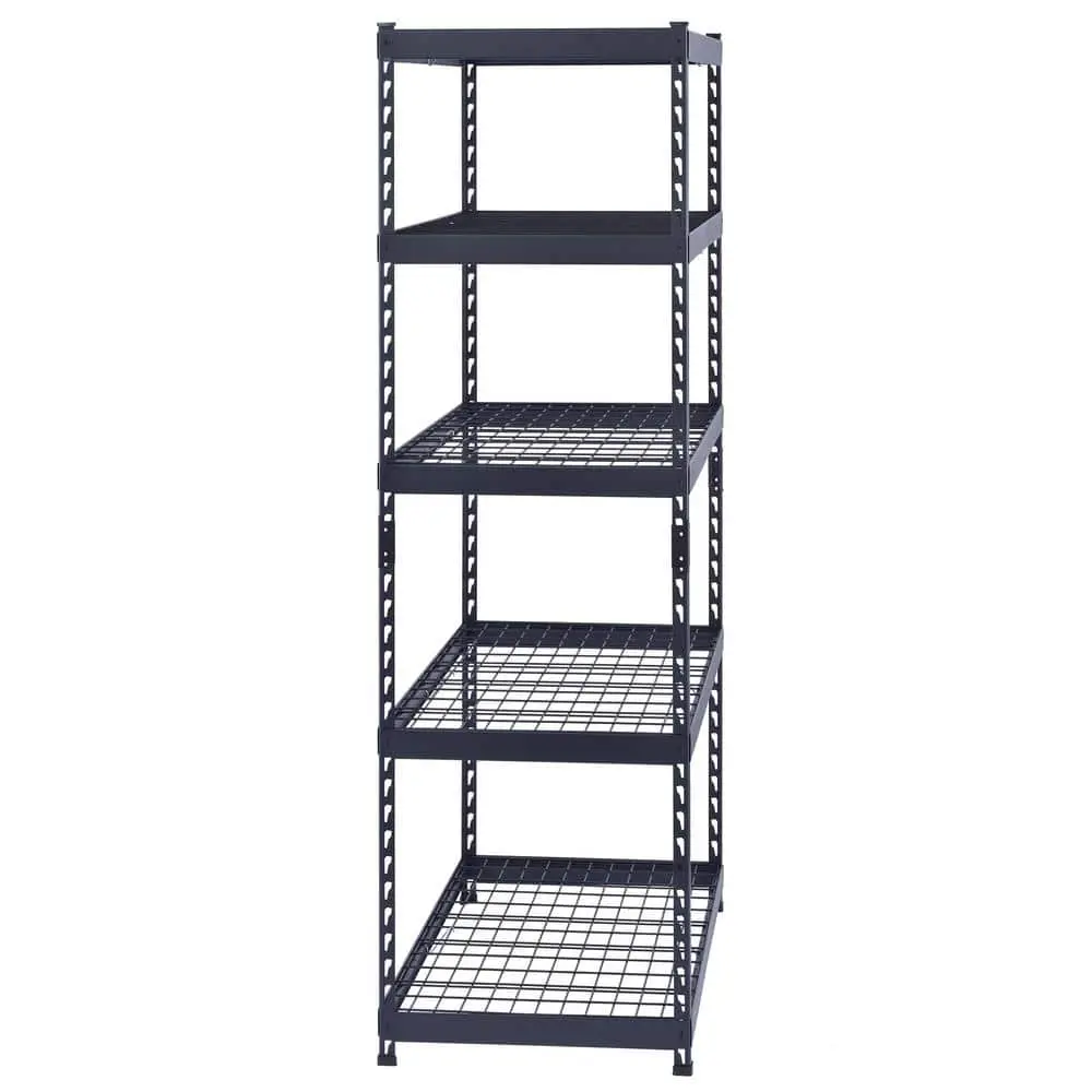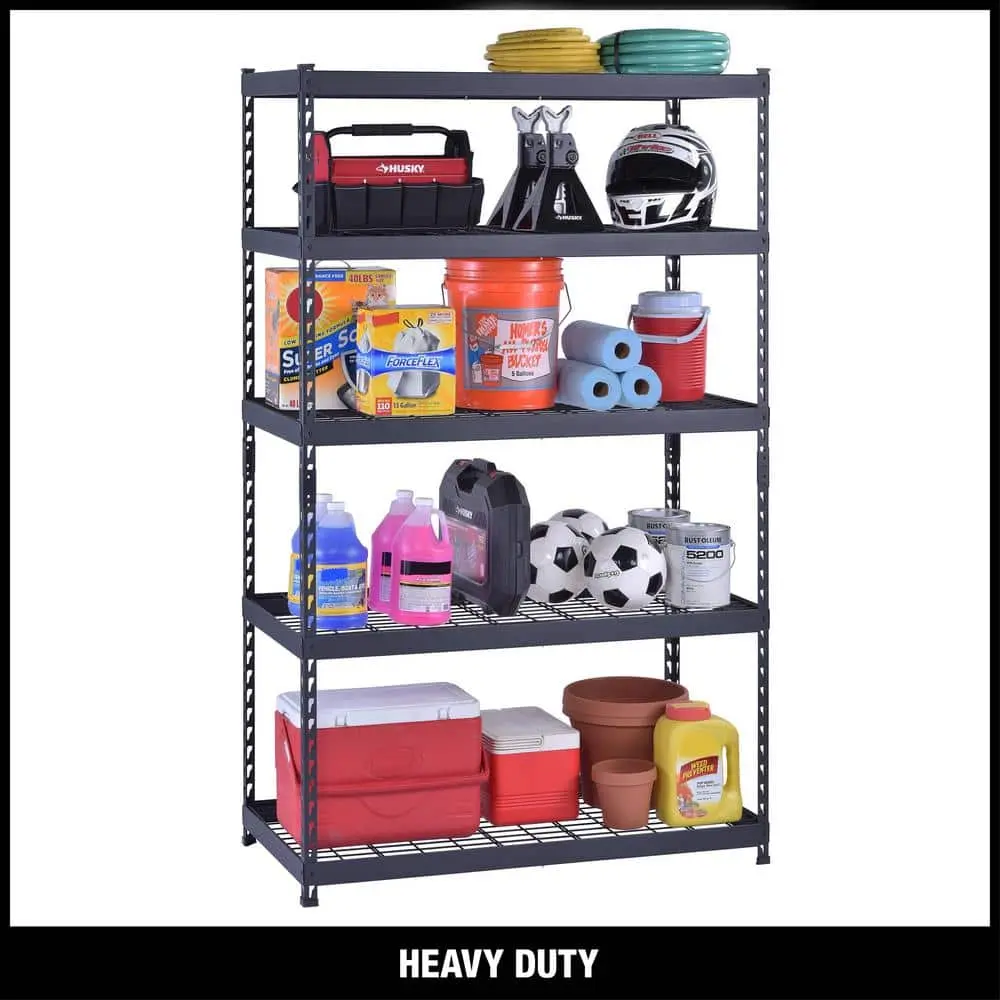 The Husky 5-Shelf Steel Heavy-Duty Garage Storage Shelving Unit is designed to provide robust and reliable storage for all your garage needs. Constructed with heavy-duty steel, it ensures lasting durability and strength for holding heavy items. The black finish not only enhances its sleek look but also provides added corrosion resistance. Featuring 5 shelves that are adjustable, you can customize the height to accommodate a variety of items. With the ability to support up to 1,000 lbs., this unit is perfect for storing tools and equipment. Measuring 48 in. W x 24 in. D x 78 in. H, it offers ample storage space. The unit is easy to assemble with no tools required, making setup quick and hassle-free