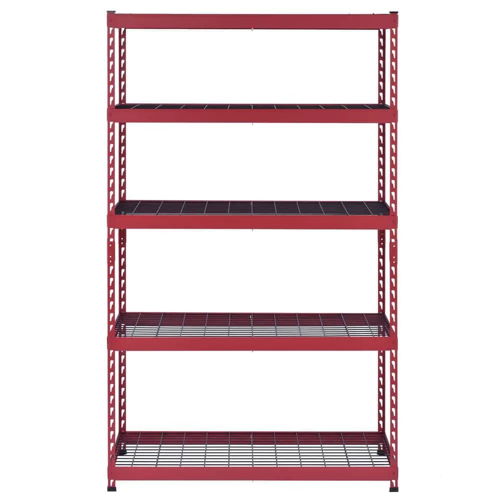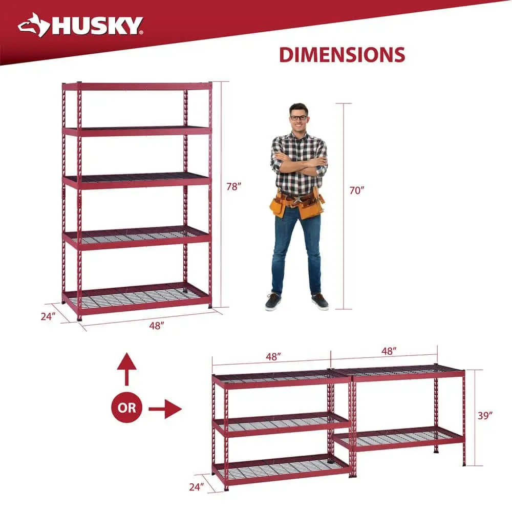 The Husky 5-Shelf Steel Heavy-Duty Garage Storage Shelving Unit offers exceptional strength and reliability for organizing your space. Made from durable steel construction, this shelving unit is built to withstand heavy use. With 5 adjustable shelves, it provides flexible storage options, while each shelf can support up to 800 lbs, allowing for a total weight capacity of 4,000 lbs. Its compact size of 48" W x 24" D x 78" H makes it a perfect fit for garages, workshops, or warehouses. The powder-coated red finish ensures long-lasting durability and rust resistance, and the unit is designed for easy assembly with no tools required, making it a convenient and practical storage solution.