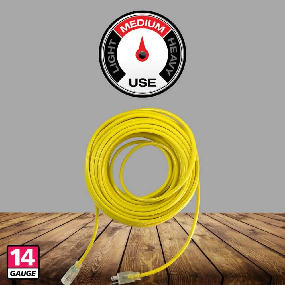 The Husky 50 ft. 14/3 Yellow Medium Duty Lighted Extension Cord combines convenience and safety. The highly visible yellow SJTW jacket makes it easy to spot, even in low light conditions. The lighted plug features an indicator that shows when power is flowing through the cord. The durable outer jacket resists abrasion and damage from moisture and sunlight while protecting your floors and walls. The SJTW jacket remains flexible even at temperatures as low as -35°F.