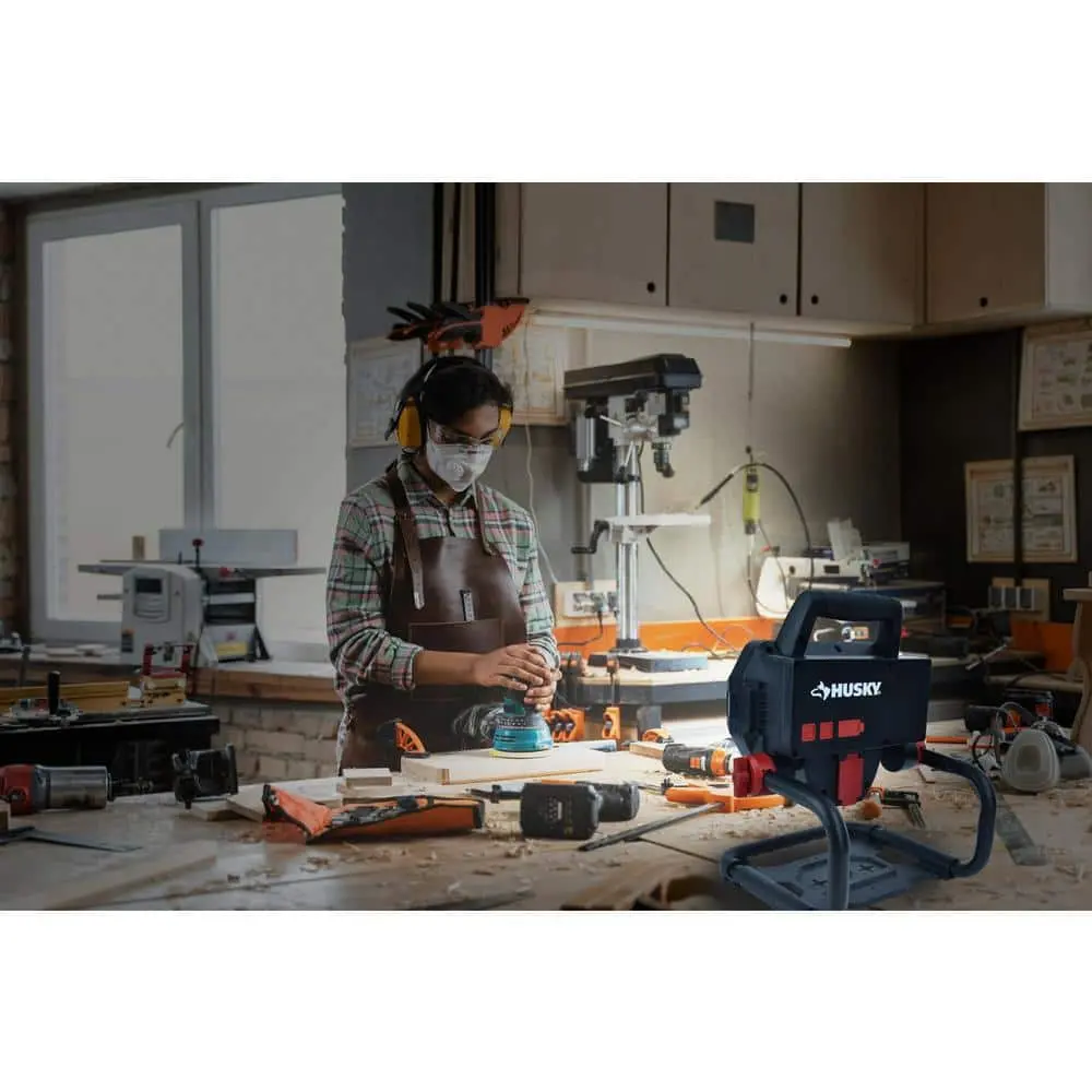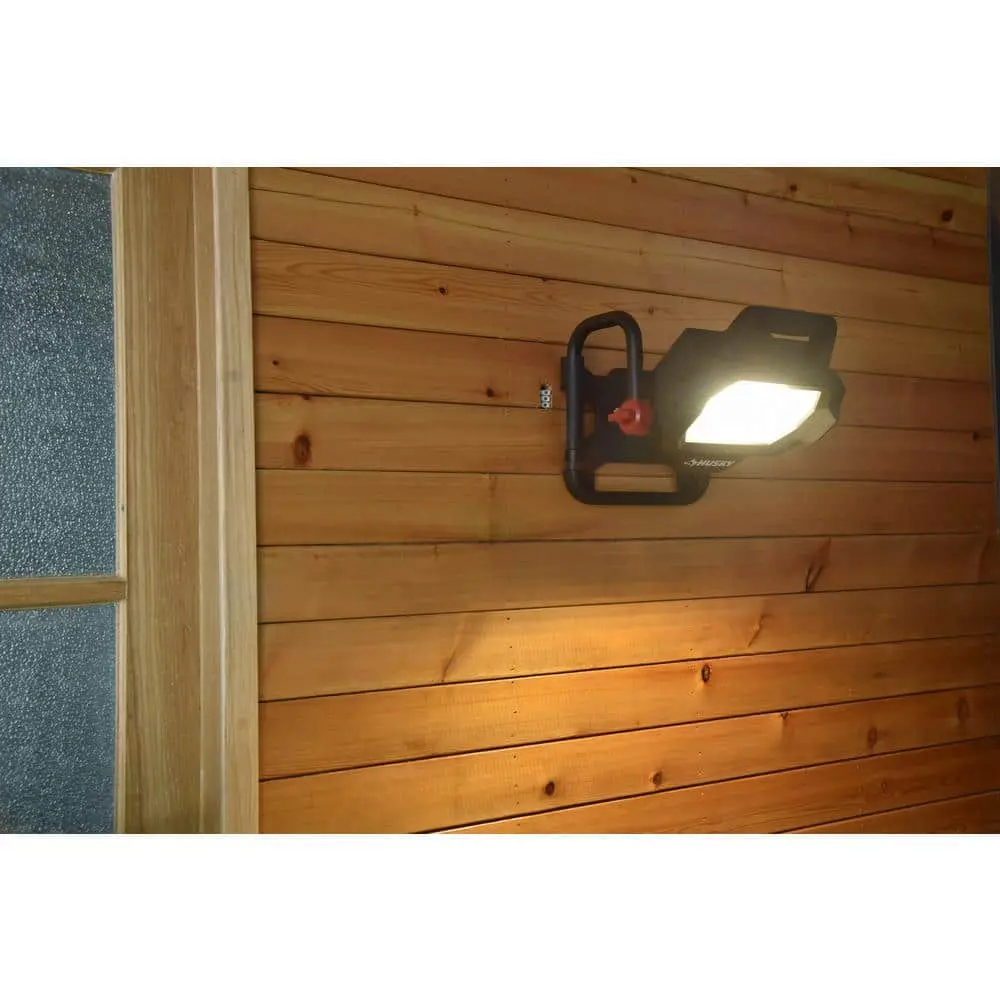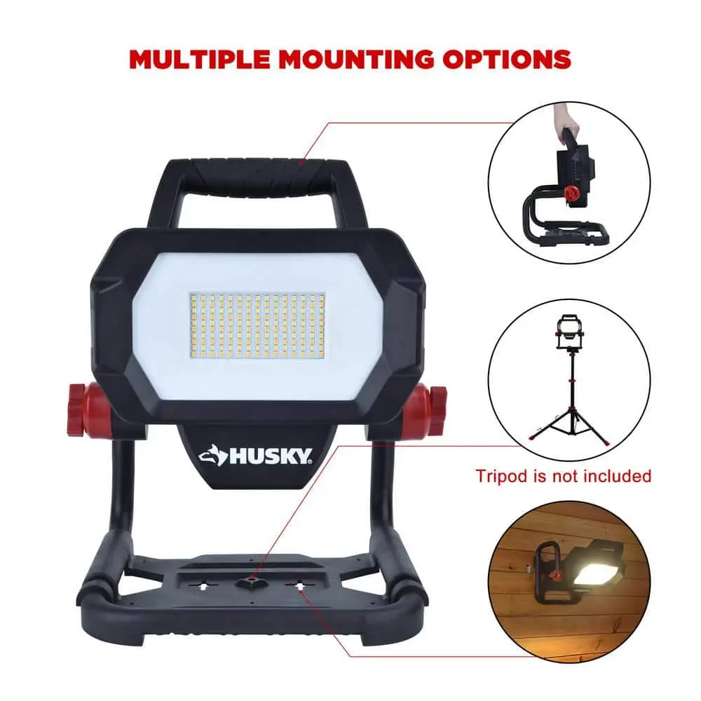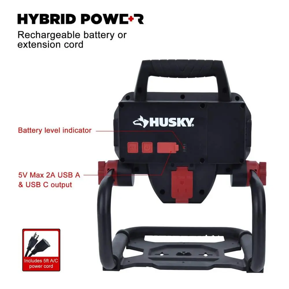 Designed for reliability and versatility, this high-intensity dual power LED work light ensures you never run out of power. It can be powered either by the built-in rechargeable Li-ion battery, offering up to 10 hours of cordless runtime, or by an extension cord for continuous use. The power indicator feature helps track remaining battery life, and when the battery is low, simply plug in the included 5ft AC power cord to keep the work going. Constructed with durable, die-cast aluminum, it’s built to withstand tough conditions. The light head can pivot 180° vertically, and the 3 selectable color temperature settings (3000K, 4000K, 5000K) make it adaptable to various tasks. With a maximum output of 6,000 lumens on AC power and 2,000 lumens on DC power, it offers three brightness settings for different work environments. Additionally, the light is compatible with a Husky tripod (sold separately) and can be mounted on a wall. Its foldable design and easy-grip handle allow for convenient storage and portability, while the 5V Max 2A USB-A and USB-C outputs are perfect for charging other devices on the go. Perfect for auto repairs, painting, car detailing, construction work, and more.