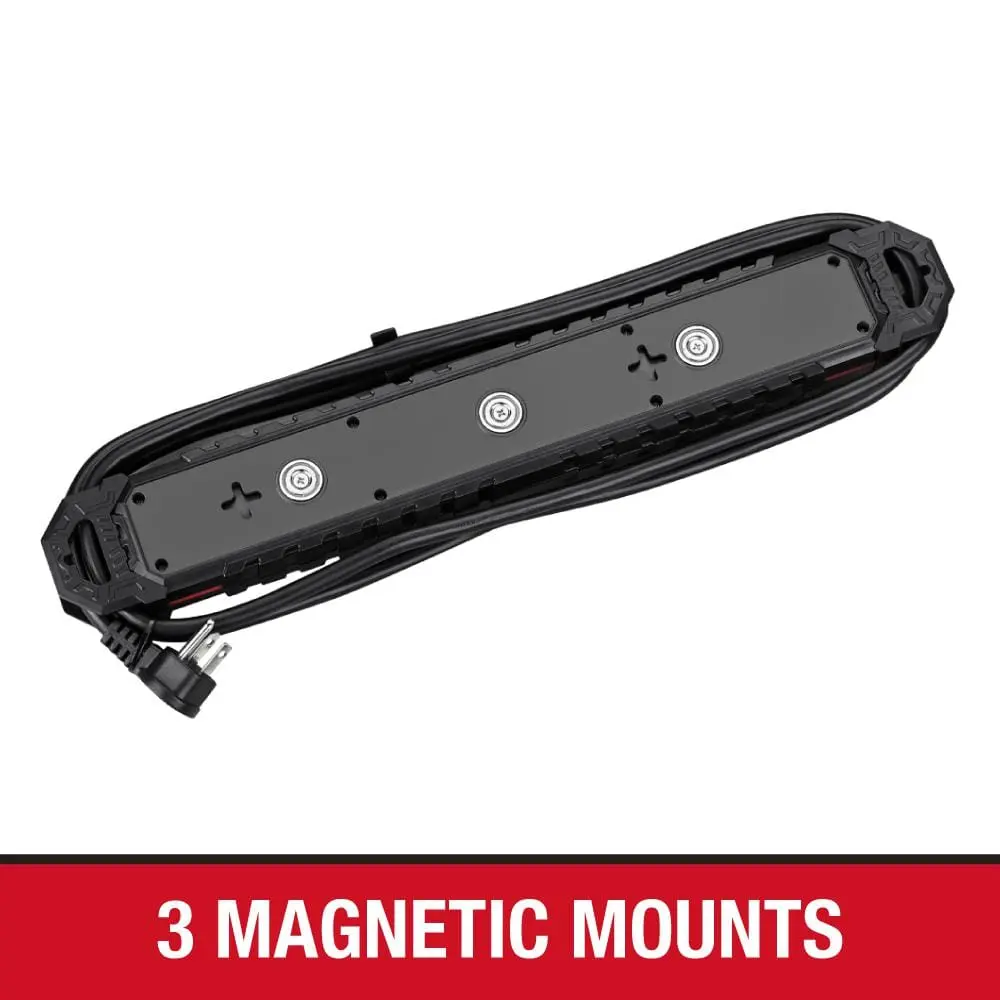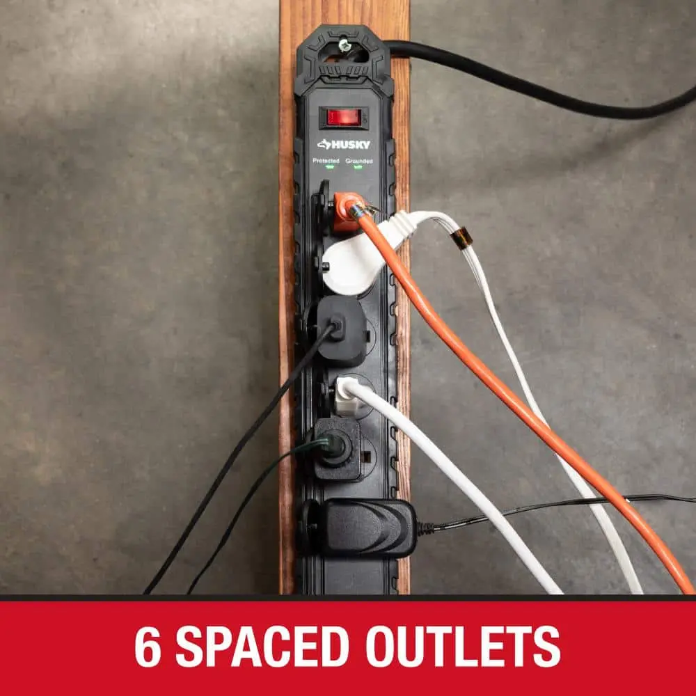 The Husky 8 ft. 6-Outlet Surge Protector with USB-A and USB-C connections is perfect for powering tools and electrical devices in your workshop or garage. Built with durable rubber covers and a thick bumper, it is designed to handle heavy-duty use. It features an 8 ft. cord with a 45º angled plug for extended reach and added flexibility.
