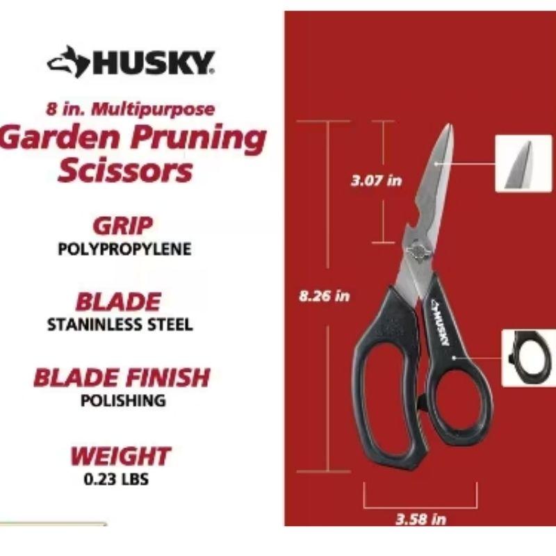 The Husky 8 in. Multipurpose Garden Pruning Scissors are versatile and efficient tools designed for various gardening tasks. Key features include: Length: 8 inches, providing a comfortable size for handling and precision cutting. Blade Type: Typically features sharp, stainless steel blades for clean and precise cuts. Design: Multipurpose design suitable for pruning, trimming, and cutting various types of plants and flowers. Handles: Ergonomic, often with non-slip grips for comfortable use and reduced hand strain. These pruning scissors are ideal for detailed garden work, offering both functionality and ease of use for maintaining healthy plants. Dimensions Blade Length (in.):4.43 in Handle Length (in.):4.35 in Product Depth (in.):0.59 in Product Height (in.):3.58 in Product Width (in.):8.26 in