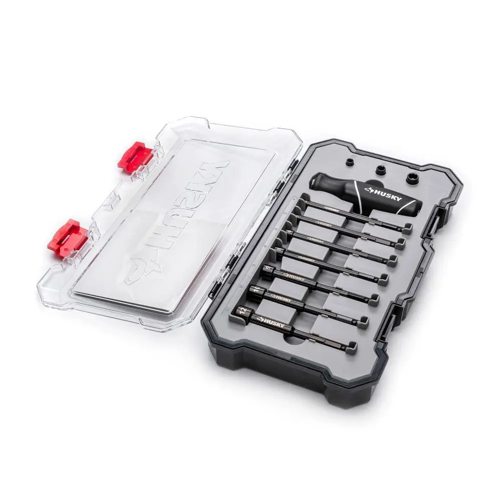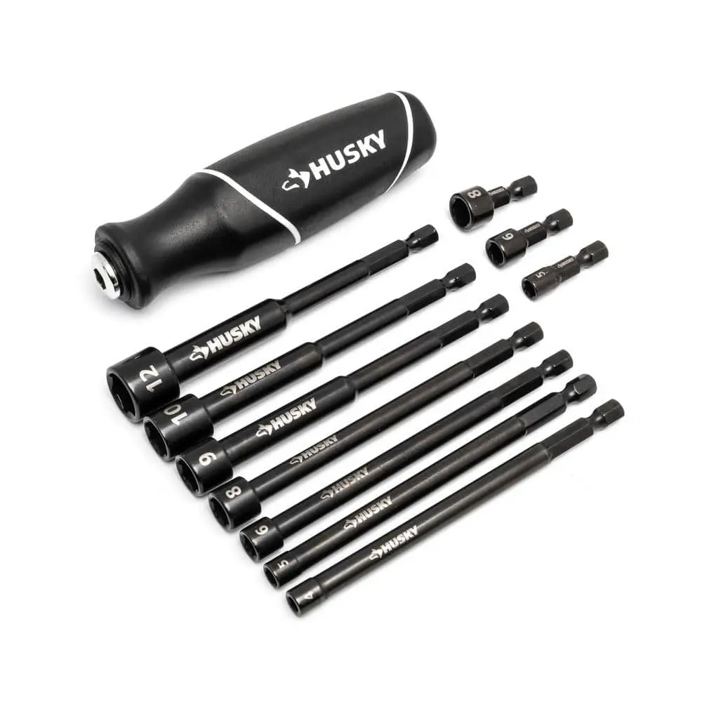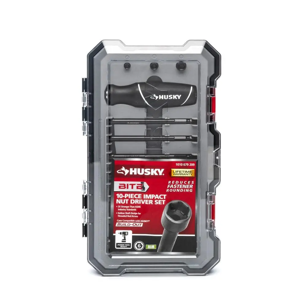 The new Husky BITE 10-Piece Metric Nut Driver Set features 10 interchangeable drivers and 1 ergonomic cushion grip handle. Driver bits are constructed of chromoly for superior durability. The cushion grip handle helps reduce fatigue and provides additional comfort for ease of use. The driver ends feature a unique gripping profile, allowing the user to apply 2x more torque before a fastener rounds versus a standard driver end. Hollow shafts provide higher maximum bolt clearance, enabling access to longer bolts or threaded rods