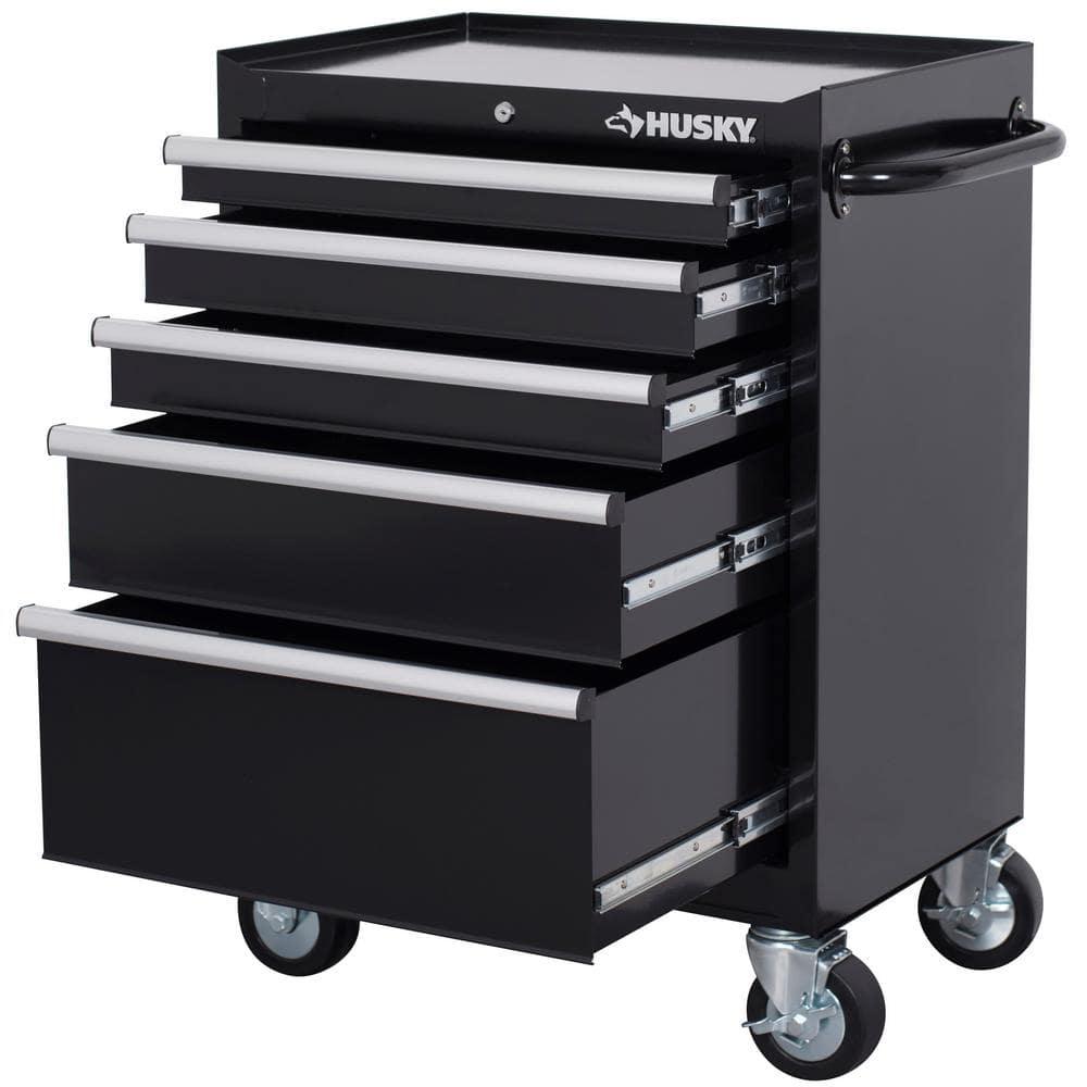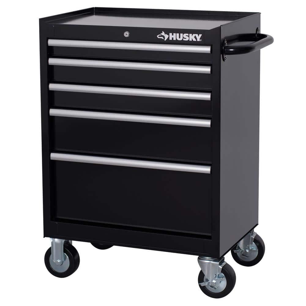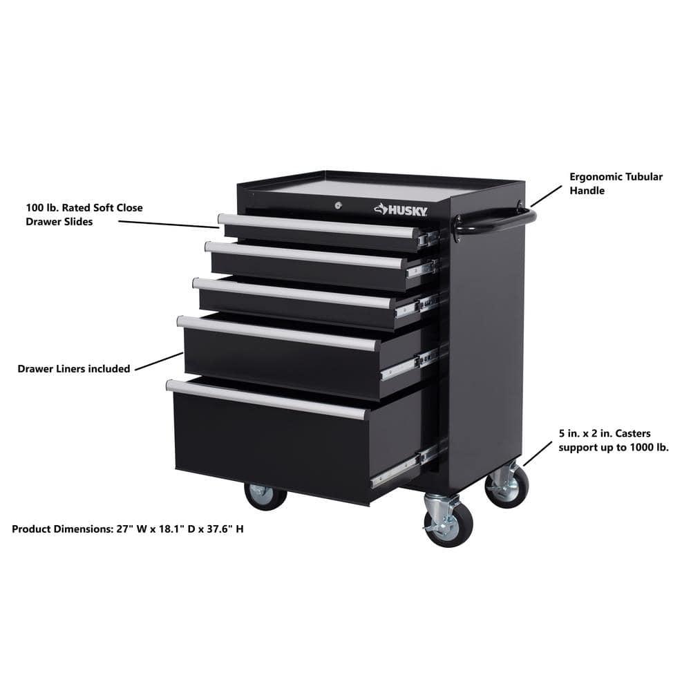 Husky 27-Inch 5-Drawer Rolling Tool Cabinet: Your Ultimate Workspace Solution Keep your garage organized and your tools easily accessible with the Husky 27-Inch 5-Drawer Rolling Tool Cabinet. This durable and versatile tool cabinet is designed to meet the needs of both DIYers and professional craftsmen. Key Features: Ample Storage: With five drawers of varying sizes, including a large bottom drawer, you'll have plenty of space to store all your tools and equipment. Durable Construction: The all-welded steel construction and rust-resistant powder coat finish ensure long-lasting durability and protection. Smooth Operation: The soft-closing ball bearing slides allow for easy access to your tools and can handle heavy loads. Portability: The rolling casters and ergonomic handle make it easy to move the cabinet around your workspace. Security: The internal locking system with two keys provides added peace of mind.