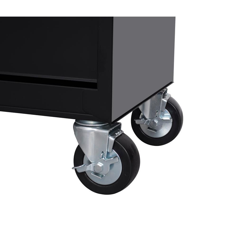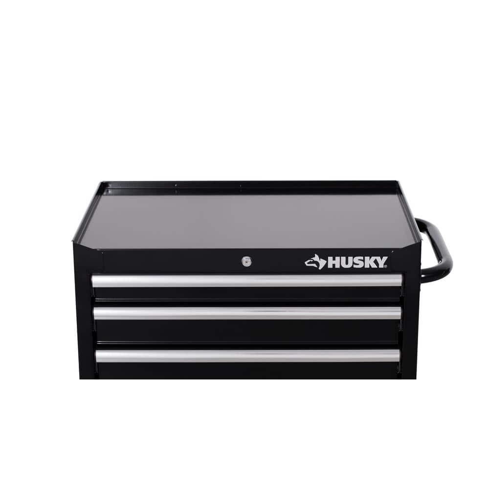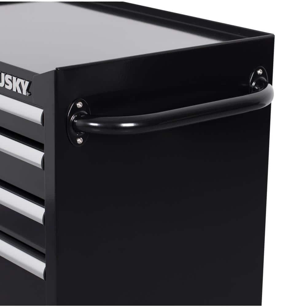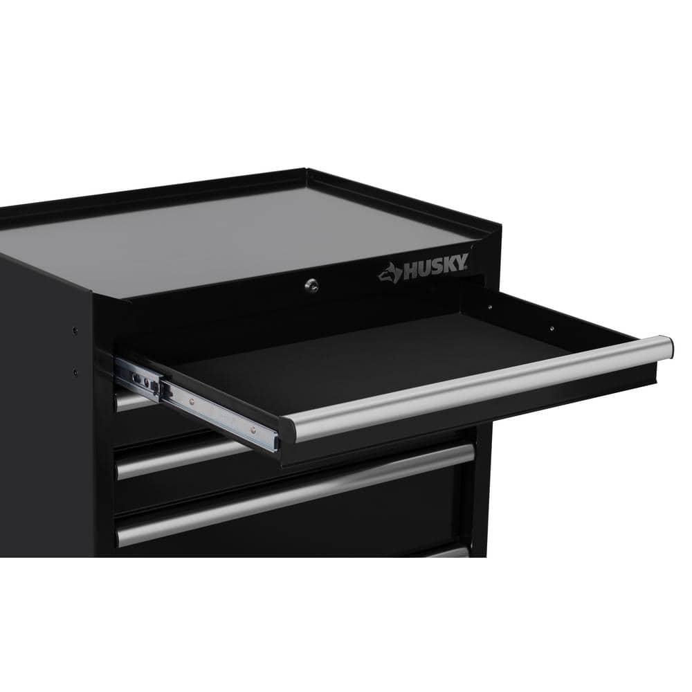 Husky 27-Inch 5-Drawer Rolling Tool Cabinet: Your Ultimate Workspace Solution Keep your garage organized and your tools easily accessible with the Husky 27-Inch 5-Drawer Rolling Tool Cabinet. This durable and versatile tool cabinet is designed to meet the needs of both DIYers and professional craftsmen. Key Features: Ample Storage: With five drawers of varying sizes, including a large bottom drawer, you'll have plenty of space to store all your tools and equipment. Durable Construction: The all-welded steel construction and rust-resistant powder coat finish ensure long-lasting durability and protection. Smooth Operation: The soft-closing ball bearing slides allow for easy access to your tools and can handle heavy loads. Portability: The rolling casters and ergonomic handle make it easy to move the cabinet around your workspace. Security: The internal locking system with two keys provides added peace of mind.
