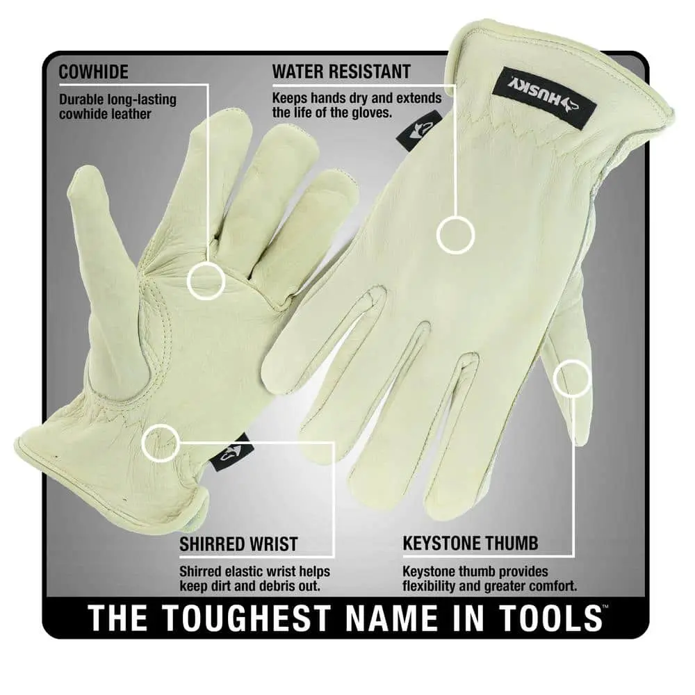 Conquer tough tasks with the Husky Water-Resistant Leather Work Glove, designed for heavy-duty work in wet and damp conditions while keeping your hands dry. Made from 100% grain cowhide, these gloves offer exceptional durability, protection, and long-term use.
