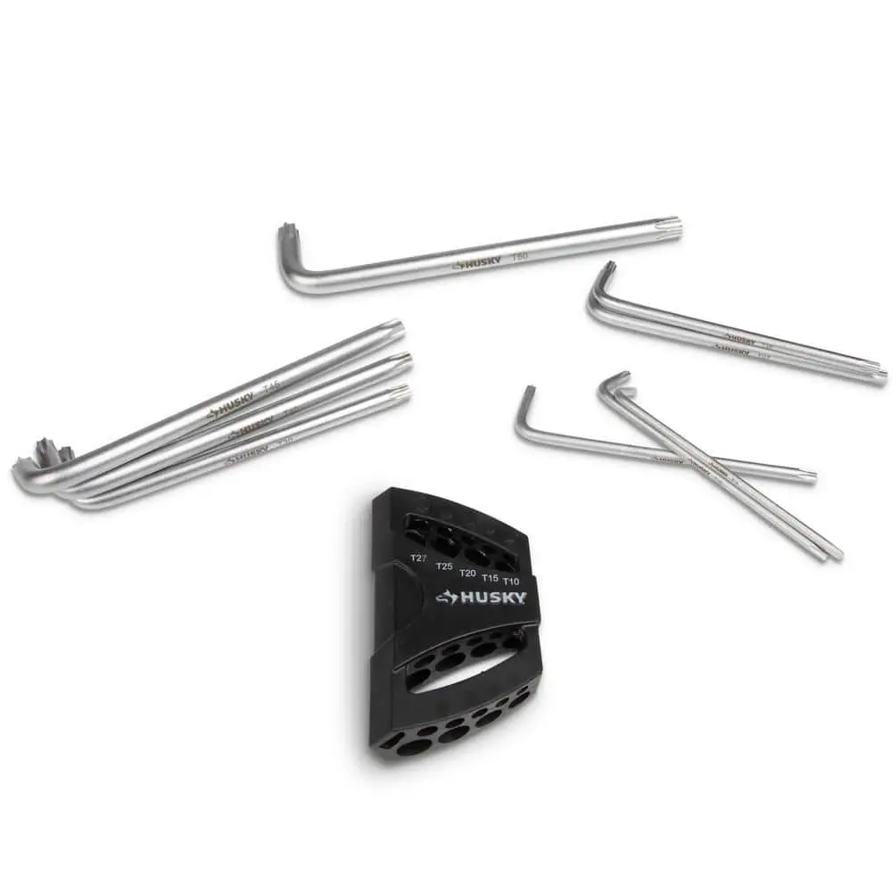 The Husky Magnetic Tamperproof TORX L-Key Set (9-Piece) is a reliable and versatile tool for various applications. Featuring tamperproof TORX tips, this set provides added security and compatibility with specialized fasteners. The magnetic tips ensure a secure grip on fasteners, improving efficiency during use. Crafted from durable steel construction, these L-keys are built to withstand heavy-duty tasks and resist wear. The set comes with a compact and organized holder, making it easy to store and transport. Perfect for automotive, electronics, and home repair projects, this set is a must-have for any toolbox