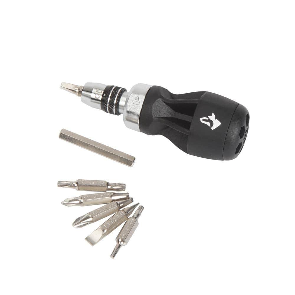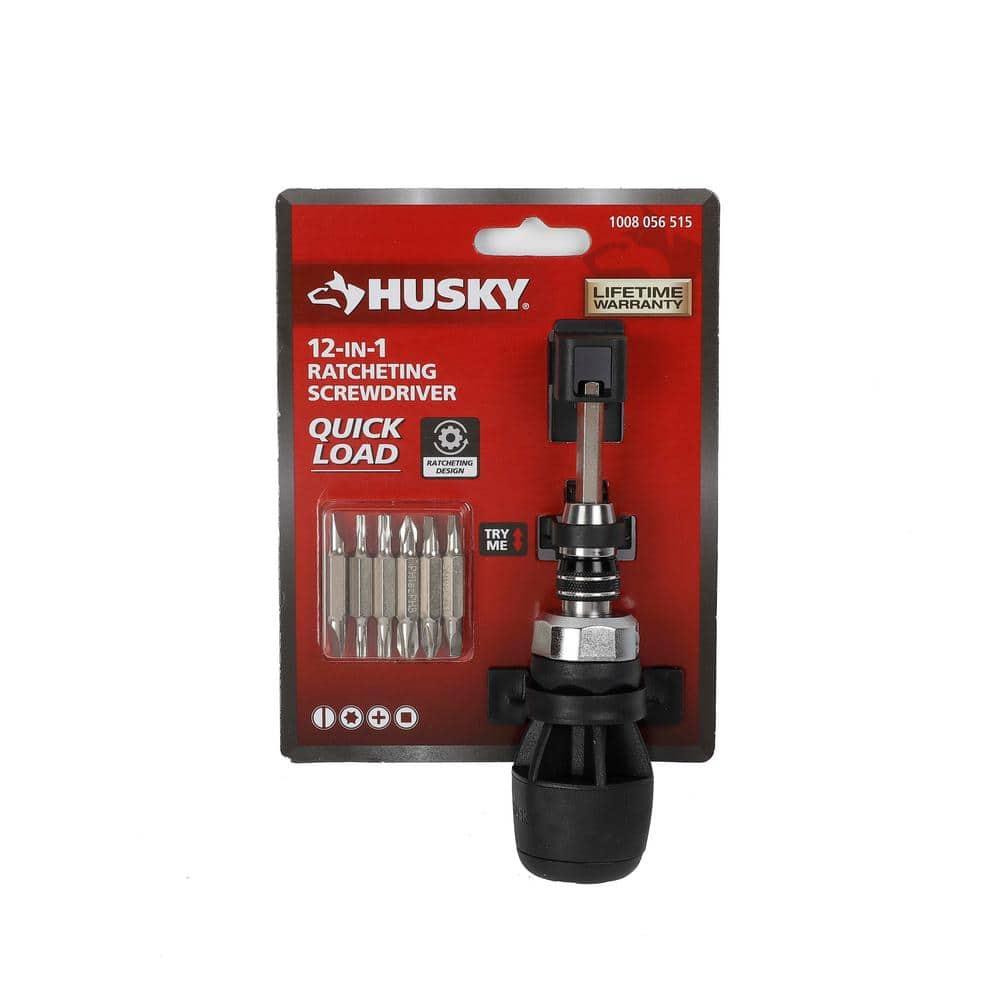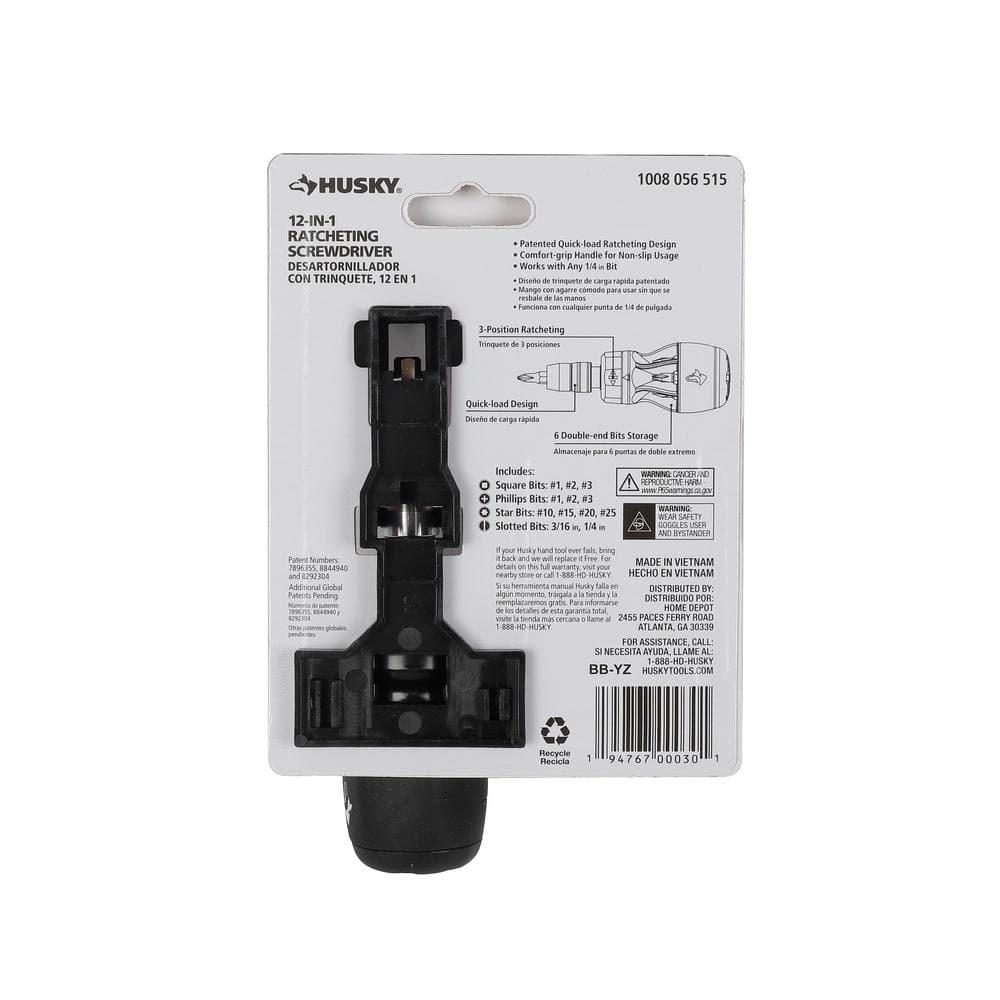 Introducing the innovative Husky 12-in-1 Quick-Load Ratcheting Stubby Screwdriver Set, designed to streamline your work with its continuous turning in one direction feature, eliminating the hassle of repositioning your hand or wrist. The chrome-plated bits provide top-notch Marine-Grade Rust Protection, ensuring durability against job site elements. With a non-slip, comfortable grip and quick-load design for fast bit changes, this ratcheting screwdriver is an essential addition to any toolbox. Equipped with 6 Driver Blade storage in the handle, it accepts all 1/4 in. blades, including power groove, straight, and double-ended options. Experience the convenience of single-handed loading for all bits and blades. This set includes Square Bits - #1, #2, #3; Phillips #1, #2, #3; Star Bits - #10, #15, #20, #25; and Slotted Bits - 3/16", 1/4". Elevate your toolkit with the ultimate in versatility and efficiency.