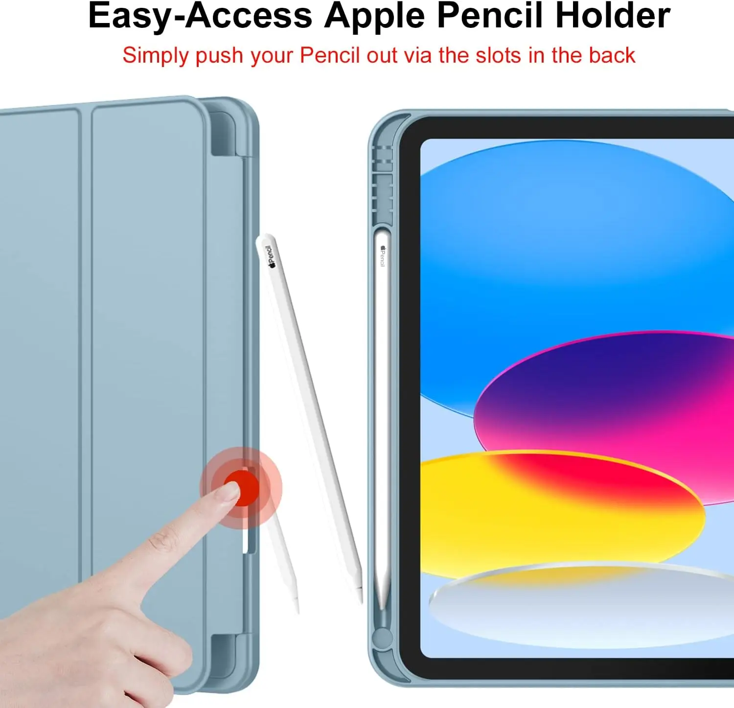 The iMieet New iPad 10.9 Inch Case (10th Gen, 2022) features a slim and lightweight design made from durable TPU material, ensuring protection from scratches and bumps. It is compatible exclusively with the iPad 10.9-inch 10th Generation (2022) model and includes a built-in Apple Pencil holder, supporting magnetic attachment and wireless charging. The case has a trifold stand for versatile viewing angles, an auto wake/sleep function, and precise cutouts for easy access to ports and features. Not compatible with other iPad models.