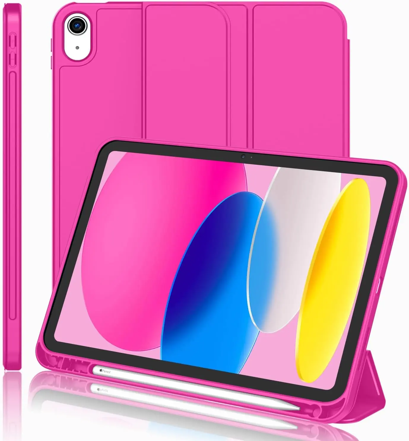 The iMieet New iPad 10.9 Inch Case (10th Gen, 2022) features a slim and lightweight design made from durable TPU material, ensuring protection from scratches and bumps. It is compatible exclusively with the iPad 10.9-inch 10th Generation (2022) model and includes a built-in Apple Pencil holder, supporting magnetic attachment and wireless charging. The case has a trifold stand for versatile viewing angles, an auto wake/sleep function, and precise cutouts for easy access to ports and features. Not compatible with other iPad models.