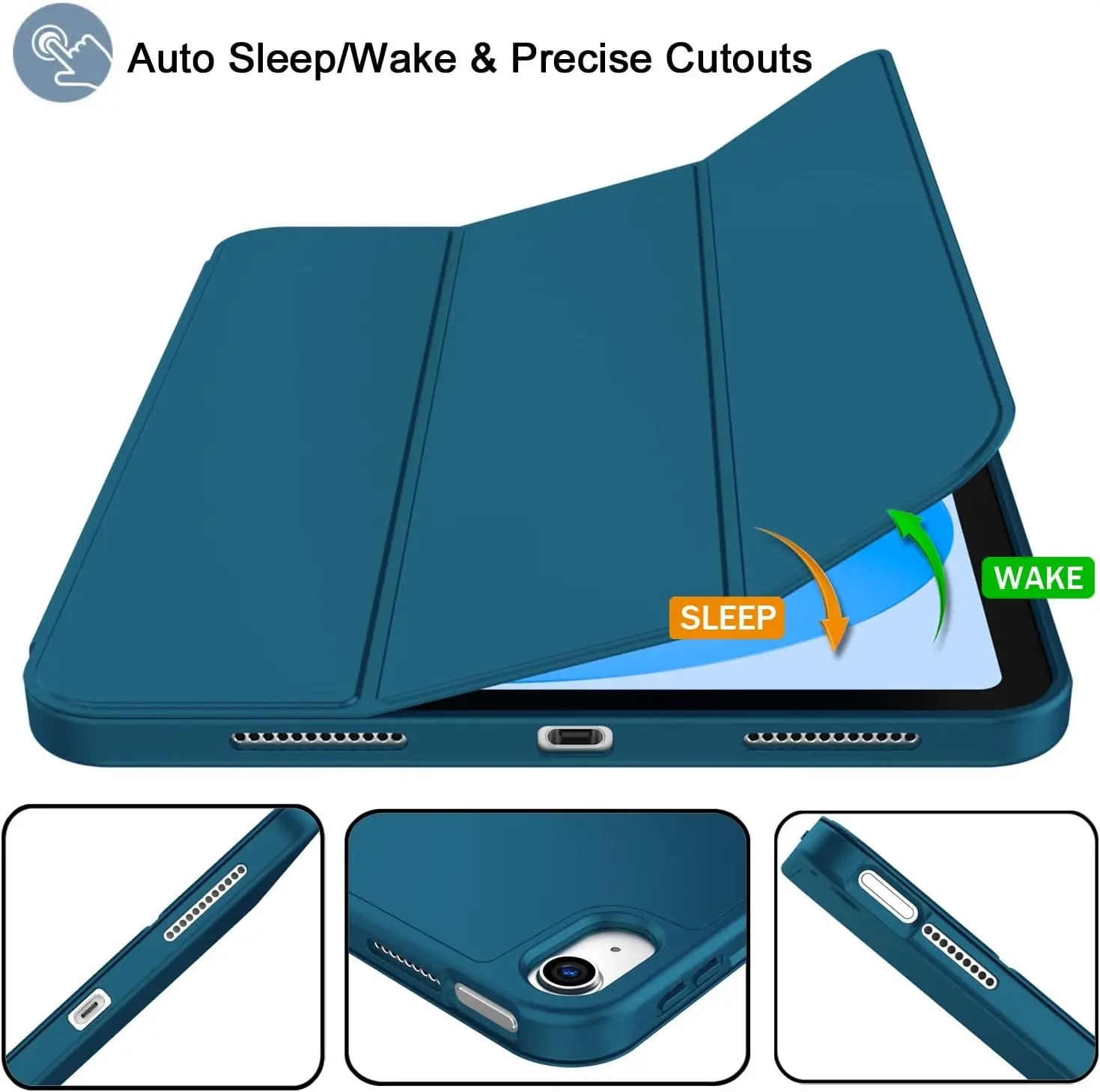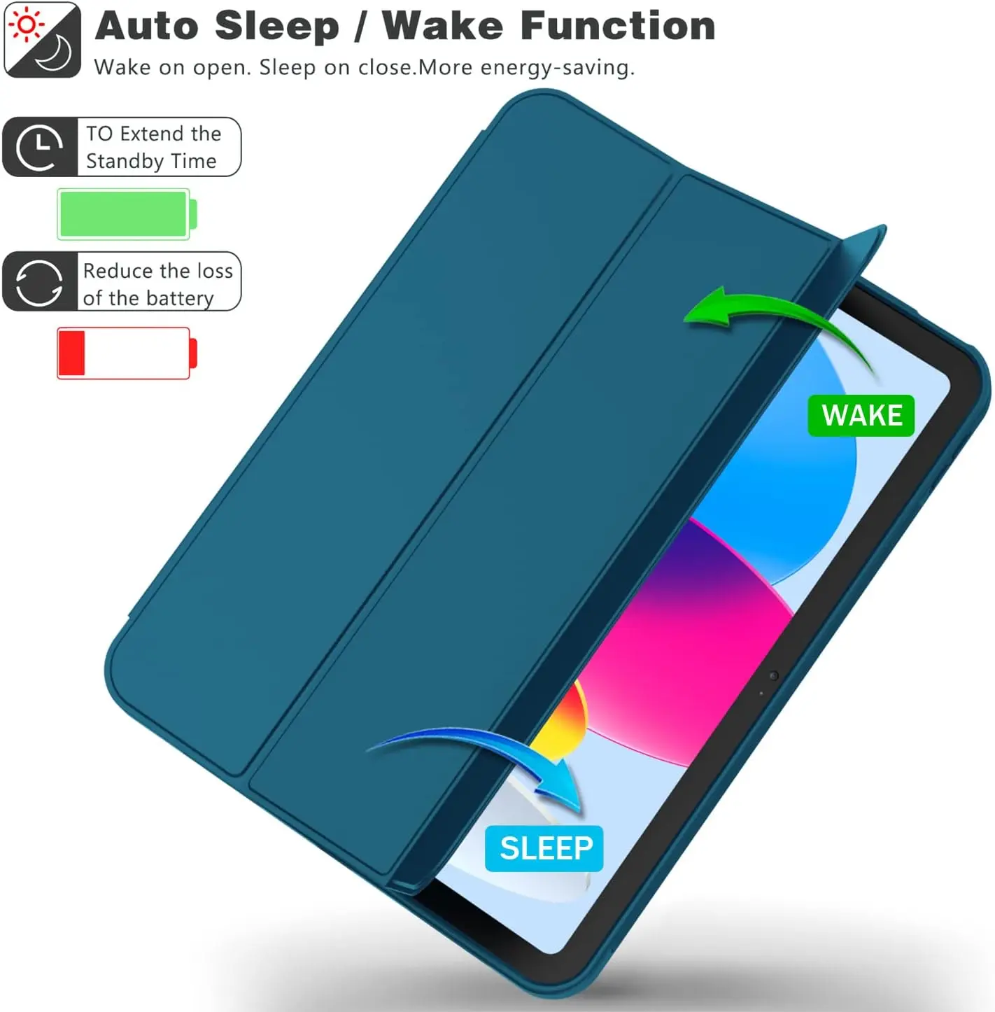 The iMieet New iPad 10.9 Inch Case (10th Gen, 2022) features a slim and lightweight design made from durable TPU material, ensuring protection from scratches and bumps. It is compatible exclusively with the iPad 10.9-inch 10th Generation (2022) model and includes a built-in Apple Pencil holder, supporting magnetic attachment and wireless charging. The case has a trifold stand for versatile viewing angles, an auto wake/sleep function, and precise cutouts for easy access to ports and features. Not compatible with other iPad models.