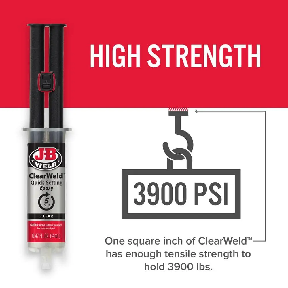 The J-B Weld 0.47 oz. ClearWeld Syringe Epoxy delivers a strong, durable bond with a transparent finish, making it ideal for discreet repairs. Its versatile formula bonds metal, wood, plastic, ceramic, glass, and more, ensuring reliable adhesion across various materials. Designed for fast-setting performance, it sets in just 5 minutes and fully cures in 1 hour for quick and efficient repairs. With a high strength rating of 4400 PSI, it provides a long-lasting, dependable hold. The easy-to-use dual-syringe design ensures precise mixing and controlled application, while the 0.47 oz. size offers a mess-free experience for small to medium repair jobs.