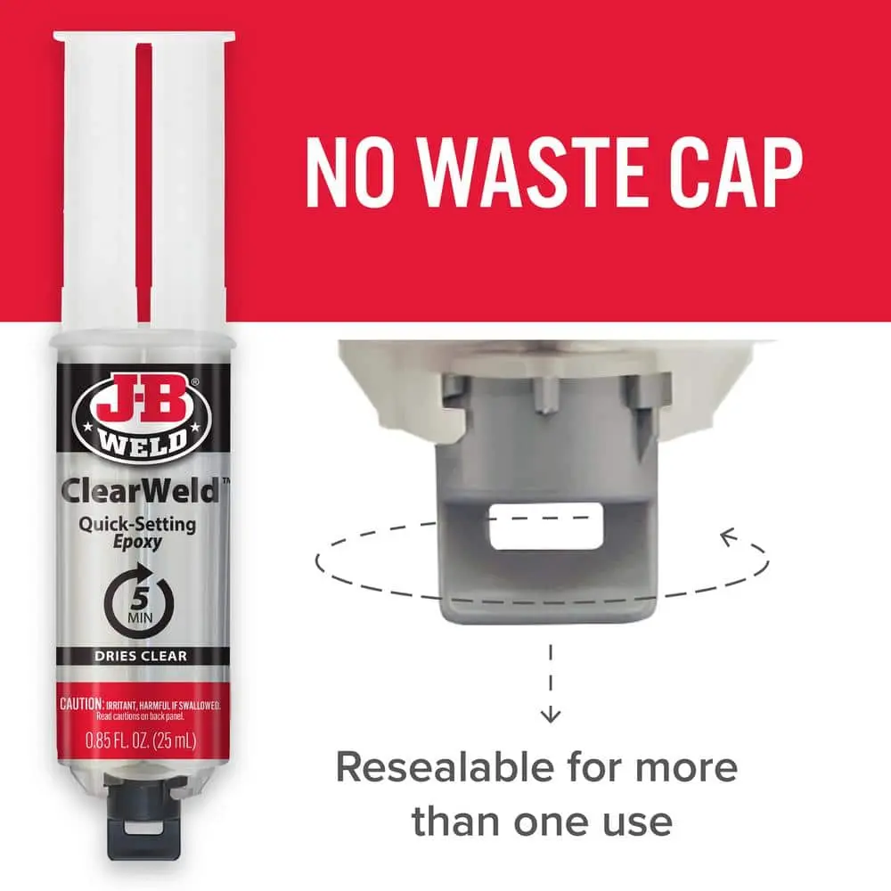 The J-B Weld 0.85 oz. ClearWeld Quick-Set Epoxy Syringe delivers a strong and clear bond, providing a durable, transparent finish for seamless repairs. With its fast-setting formula, it sets in just 5 minutes and fully cures in 1 hour, making it perfect for quick fixes. Engineered for high strength, it withstands up to 4400 PSI, ensuring long-lasting durability. Its versatile formula bonds metal, wood, plastic, ceramic, glass, and more, making it a go-to solution for various materials. Designed to be water and chemical resistant, this epoxy guarantees reliable performance even in tough conditions. The easy-to-use dual-syringe design ensures precise mixing and mess-free application, while the 0.85 oz. size is ideal for small to medium repairs