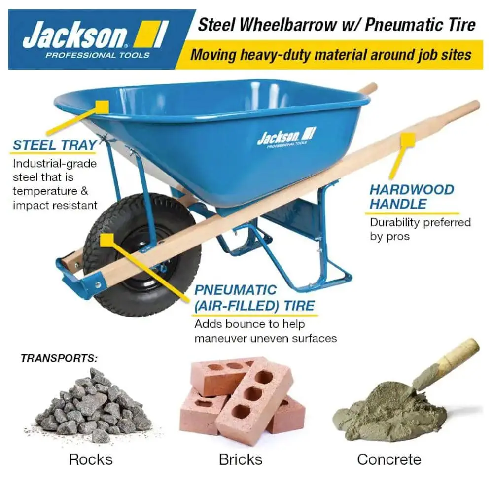 Jackson wheelbarrows are the top choice for professionals, offering exceptional quality, value, and performance. With heavy-duty steel trays, professional-grade steel undercarriages, and durable hardwood handles, they are built to withstand tough jobsite conditions. Choose Jackson for reliable, high-performance wheelbarrows that get the job done.