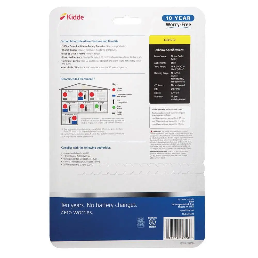The Kidde 10-Year Worry-Free Carbon Monoxide Detector is designed for easy installation and reliable protection. It alerts your family to elevated carbon monoxide levels in your home. For optimal safety, carbon monoxide alarms should be installed outside each sleeping area and on every level of your home. Additional alarms are recommended 5–20 feet from CO sources such as furnaces, water heaters, or fireplaces. Powered by a 10-year sealed, non-replaceable lithium battery, this alarm requires no hardwiring or battery replacements. The digital display updates CO levels every 15 seconds for added peace of mind. Replace the unit after 10 years of use.