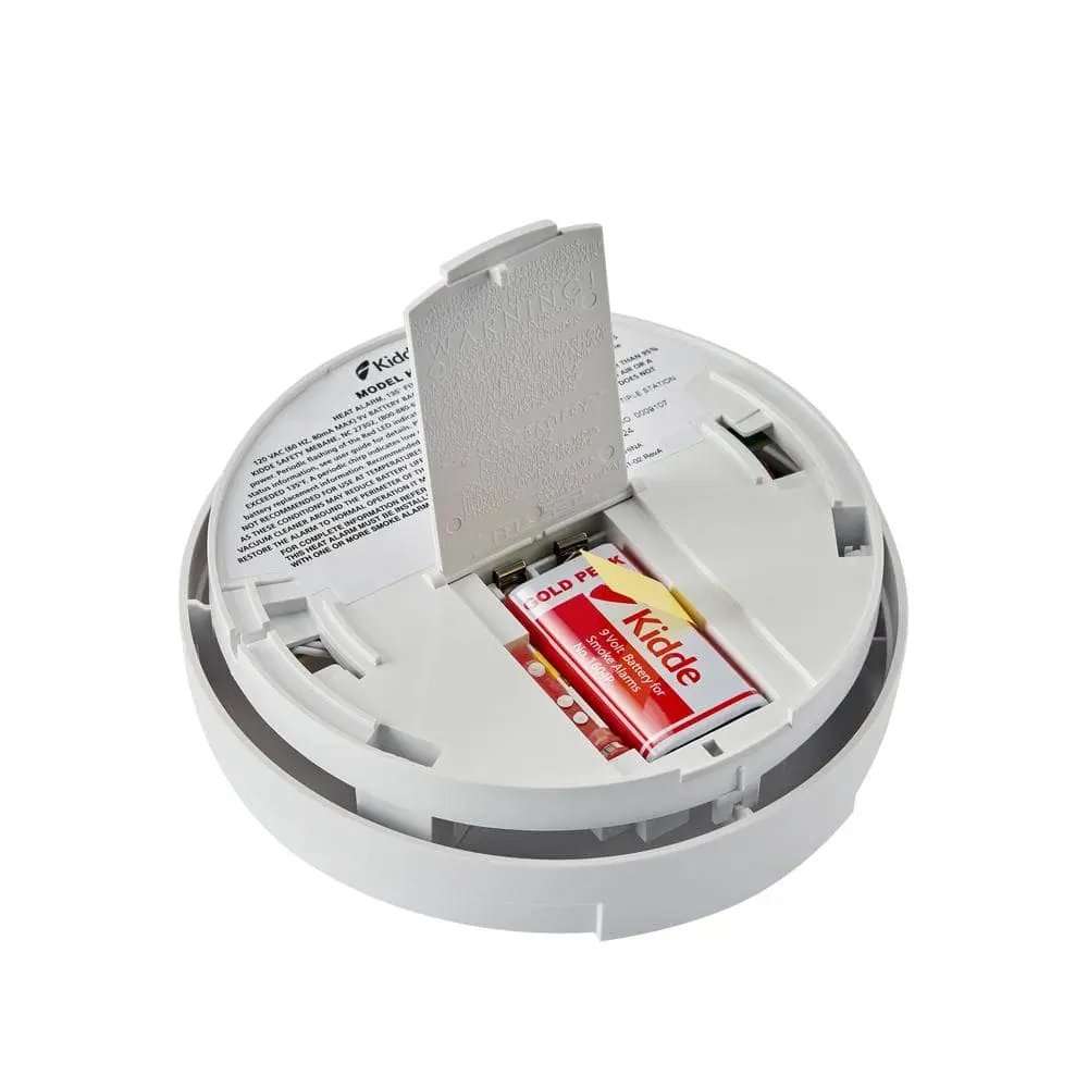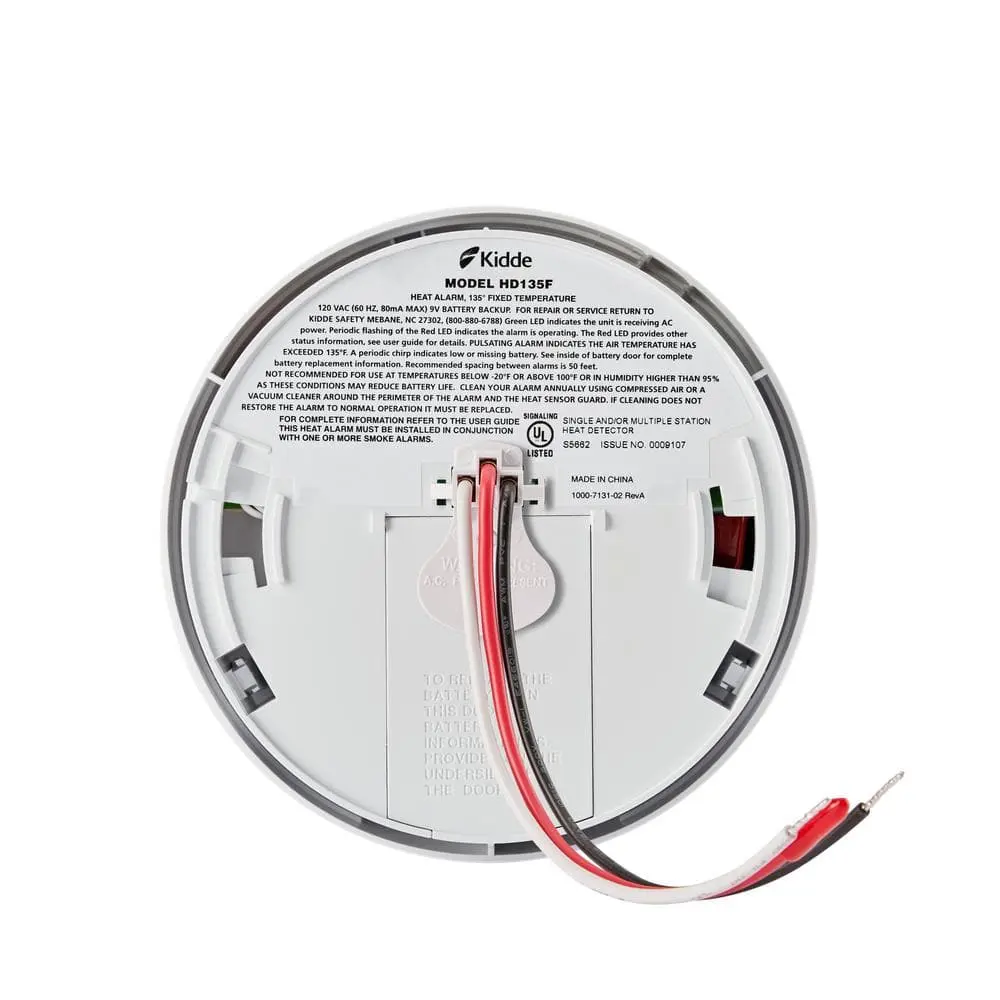 The Kidde FireX HD135F is a 120-Volt AC hardwired heat alarm that activates based on temperature rather than smoke. It triggers an alert when temperatures exceed 135°F. This alarm is interconnectable, allowing it to link with other compatible Kidde devices for a comprehensive safety system. The interconnect system supports up to 24 Kidde devices, including 18 initiating alarms, and complies with NFPA (National Fire Protection Association) standards. This unit also includes a 9-volt battery backup for continued operation during power outages and is UL Listed for reliability.