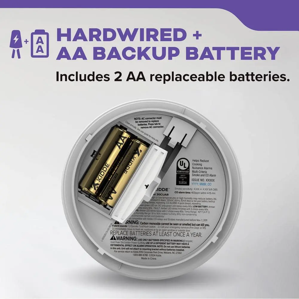 Elevate your home’s fire safety with the Kidde Hardwired Smoke & Carbon Monoxide Detector (Model 30CUAR). This advanced detector features enhanced sensing technology to reduce false alarms, often caused by cooking, and provides quick alerts to give your family more time to evacuate safely. Utilizing an electrochemical sensor for carbon monoxide detection, this alarm comes in a modern 5-inch design that fits well in living rooms, hallways, kitchens, and bedrooms. Powered by 120V AC wiring with two AA alkaline backup batteries (included), it ensures continuous protection, even during power outages. The batteries should be replaced every 6 months or when the low battery chirp sounds. When smoke or CO is detected, the red LED light flashes, accompanied by a loud 85-decibel alarm to signal danger. The test-hush button makes it easy to test battery operation and silence nuisance alarms. This self-testing alarm is easy to install with the included twist-and-click mounting bracket. Equipped with end-of-life notifications, the alarm will beep to remind you when it’s time to replace it after 10 years of use. Meets the latest UL safety standards and certifications, including UL 217, UL 2034, FCC, and CSFM.
