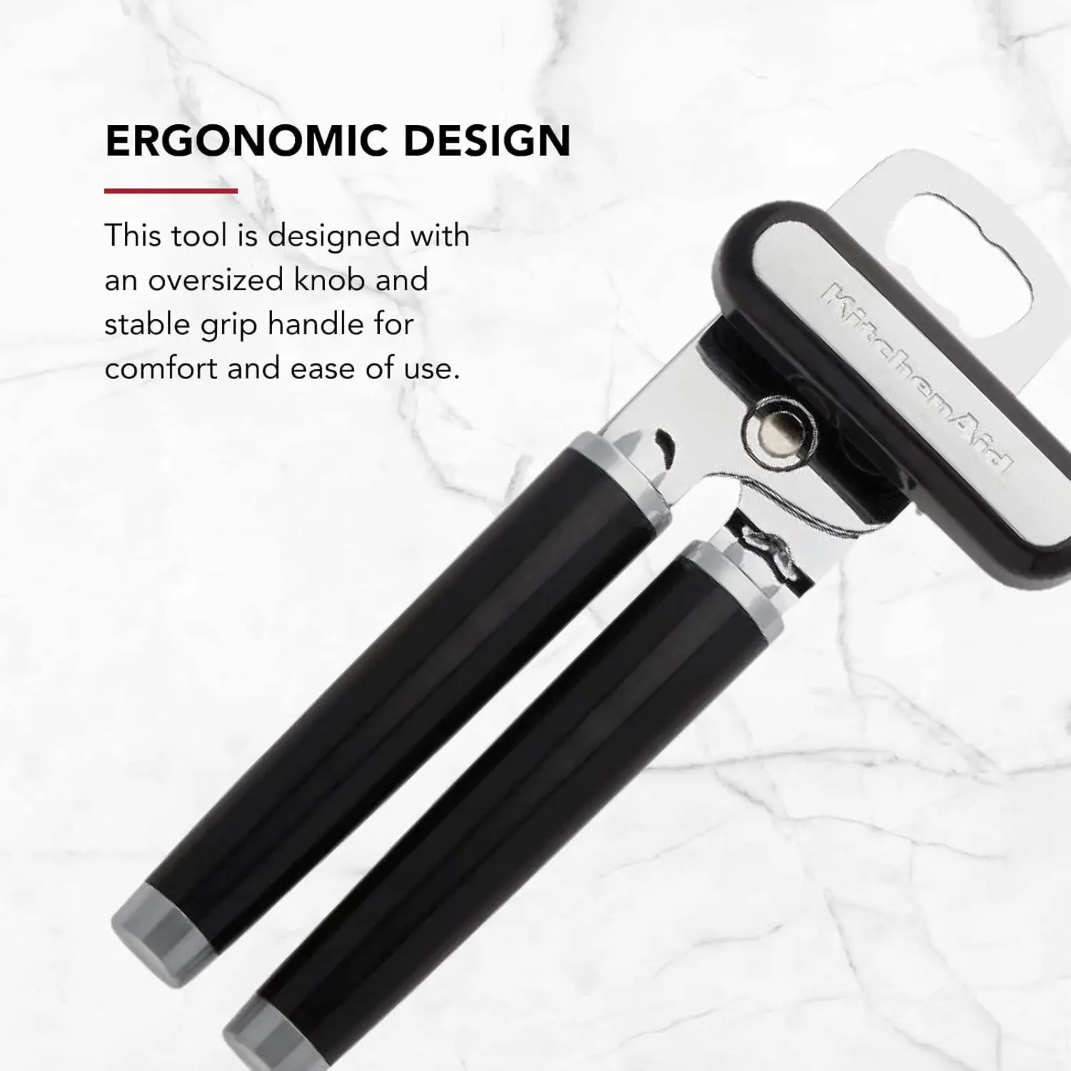 Effortlessly open any can or bottle with the KitchenAid Classic Can Opener. Its durable, razor-sharp stainless steel cutting wheel slices through cans with ease, while the large knob ensures a secure grip for smooth turning. The oversized ergonomic handles provide comfort and control for safe, simple use. This 2-in-1 tool also includes an integrated bottle opener for easy cap removal. For care, hand wash with warm water and mild detergent; rinse and dry immediately. Comes with a one-year hassle-free replacement and a lifetime limited warranty.
