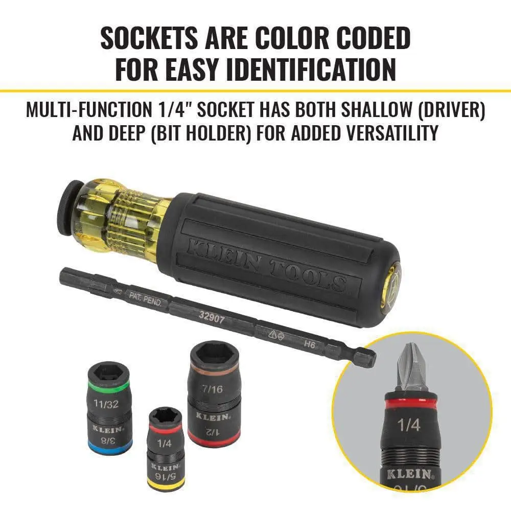 The Klein Tools 7-in-1 Impact Flip Socket with Handle, Hex Impact Socket Set (32900R) is designed for versatility and durability. Its 7-in-1 design allows for multiple socket sizes in one tool, while the hex impact sockets provide reliable performance for heavy-duty applications. Rated for impact use, it’s ideal for powering through tough tasks with a power tool. The quick-flip handle makes changing sockets fast and easy, and its durable steel construction ensures long-lasting use. Perfect for automotive and construction applications, this set is a must-have for professionals