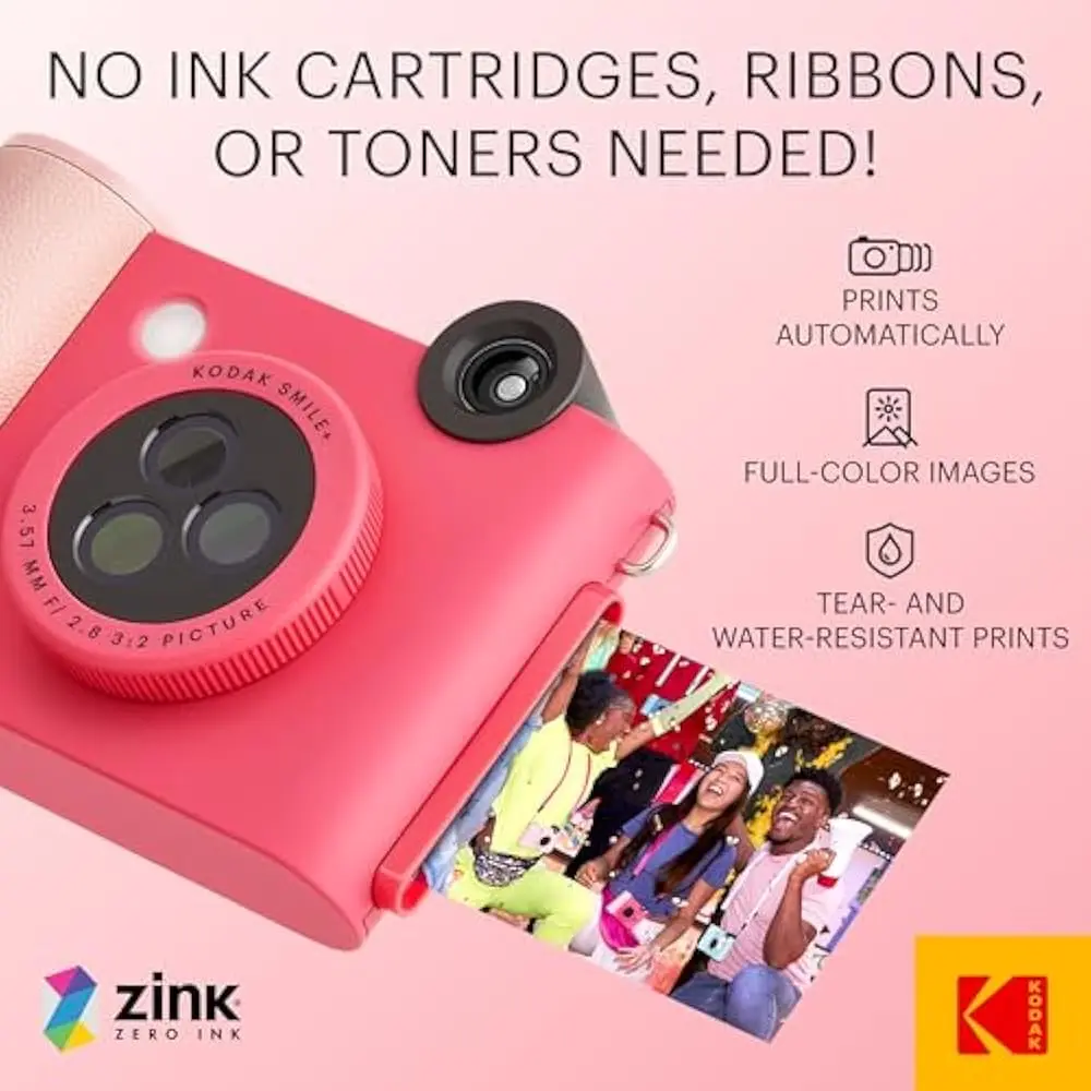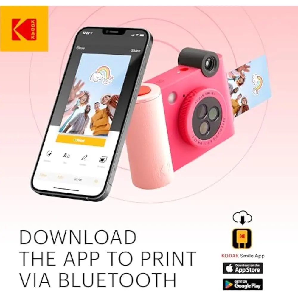 The KODAK Smile+ Wireless Digital Instant Print Camera is a versatile 2-in-1 device that functions as both a 10MP digital camera and a Bluetooth photo printer. It features a special-effect rotating lens for creative photography and prints 2x3” Zink sticky-back photos instantly. With automatic exposure control, it delivers vibrant, high-quality prints. Weighing just 1 pound, this compact and lightweight camera is easy to carry. The package includes the camera body and accessories, making it perfect for on-the-go use.