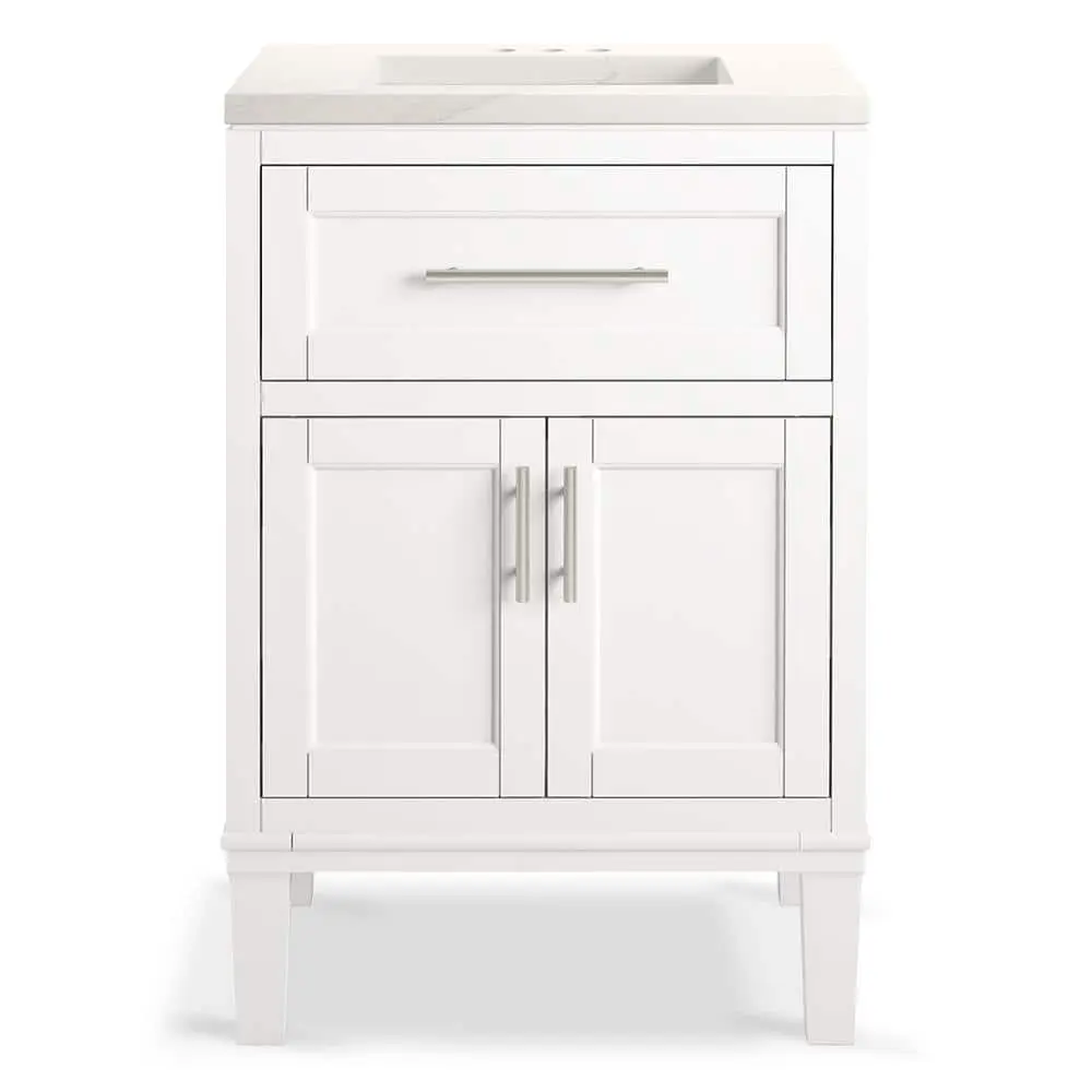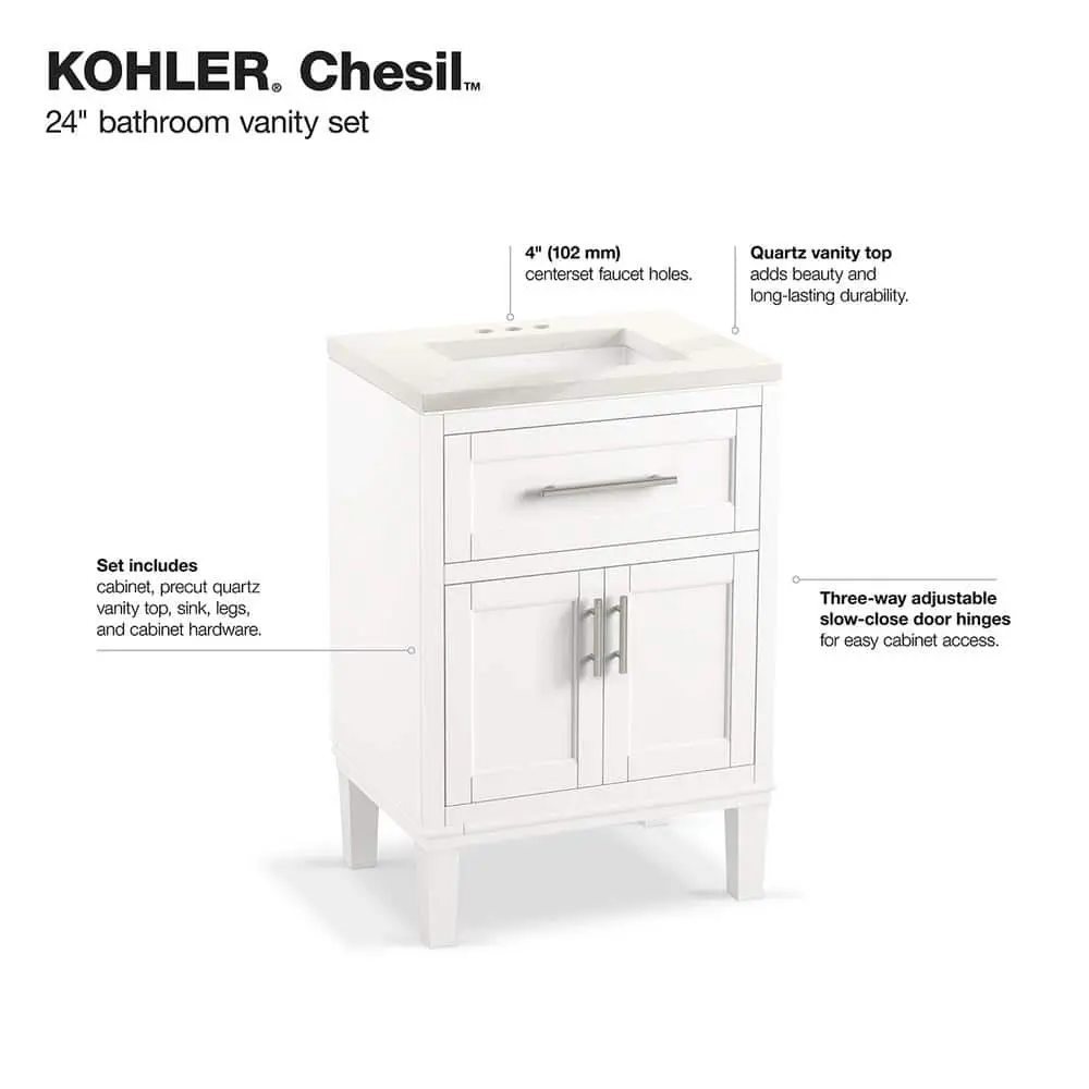 Inspired by midcentury modern design, the Chesil bathroom cabinet collection features elegant lines, subtle textures, and minimalist simplicity, blending everyday appeal with unique flair. The raised-center door and drawer panels add visual interest, complemented by sharply squared hardware pulls with delicate detailing. The vanity set includes a cabinet, quartz countertop, sink, finish-matched legs, and brushed nickel hardware.