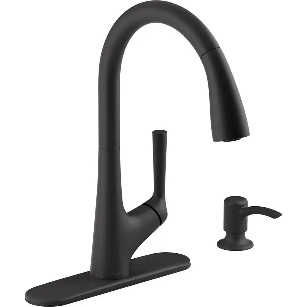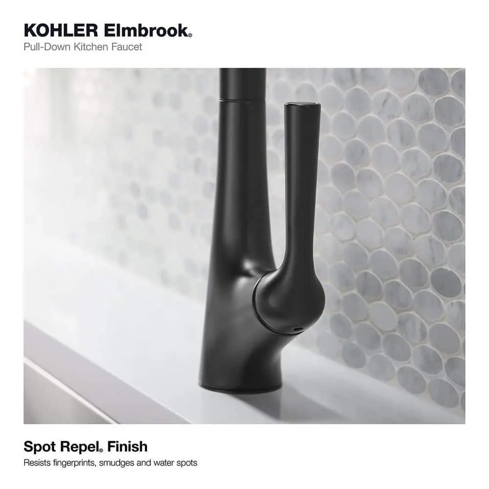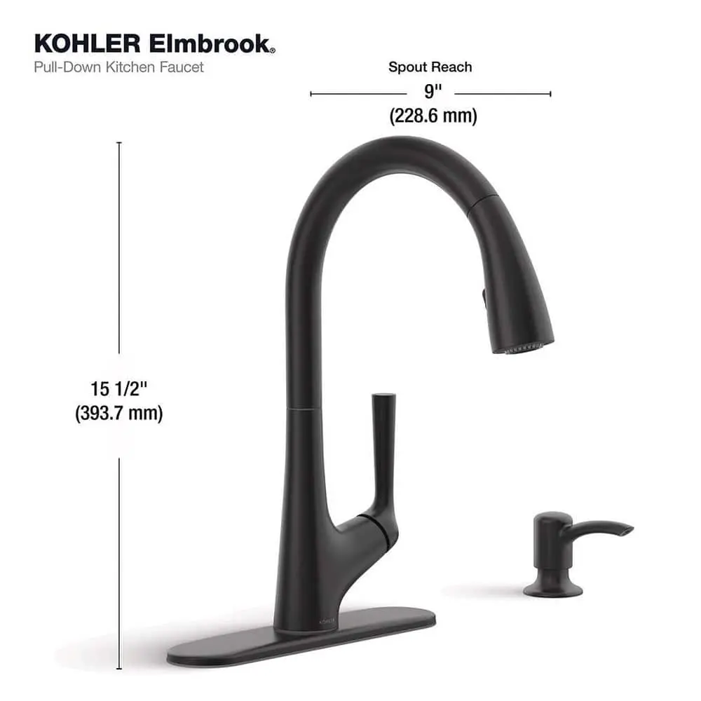 The Elmbrook pull-down kitchen faucet combines clean lines and a high, arching spout to bring a modern touch to a timeless design. Built for easy installation, it features premium materials that ensure long-lasting performance. The pull-down spray head offers a choice between stream and Sweep spray, and the faucet also includes a soap/lotion dispenser.