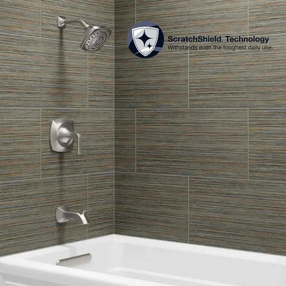 Drawing inspiration from Art Deco style, the Rubicon bath/shower faucet trim combines clean lines with subtle curves for a versatile and contemporary design. Its streamlined appearance is easy to clean and complements a variety of modern bathrooms. This set includes a multifunction showerhead, a Rite-Temp pressure-balancing valve, a single lever handle, and a bath spout, providing both functionality and elegance.