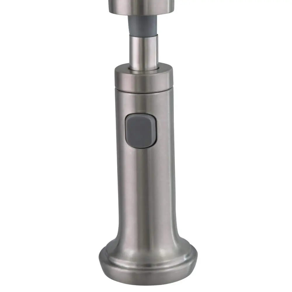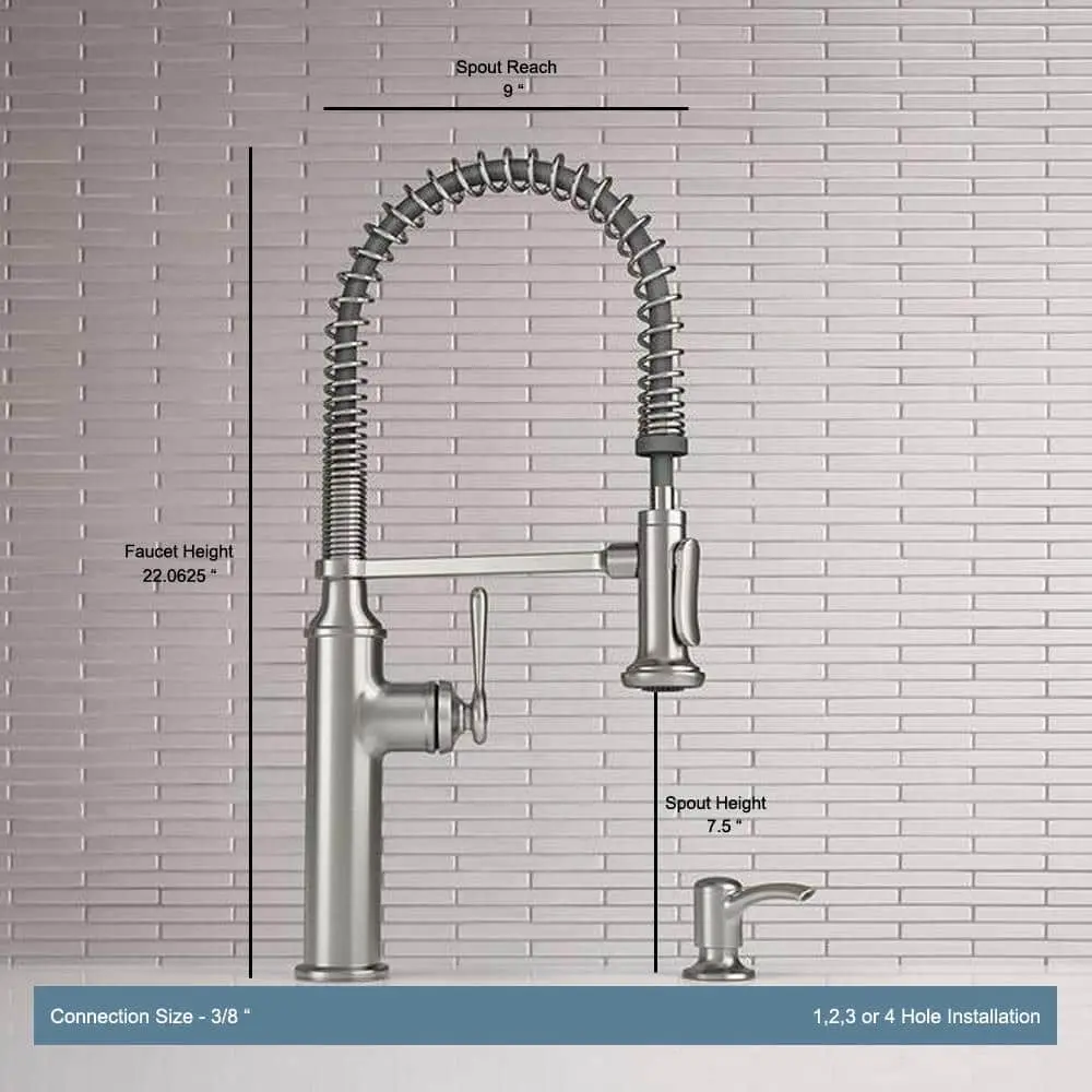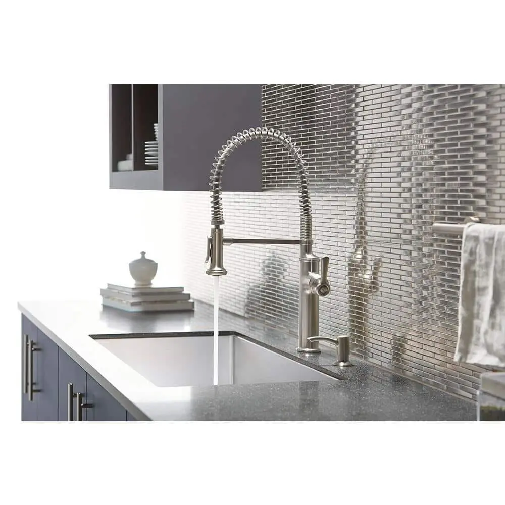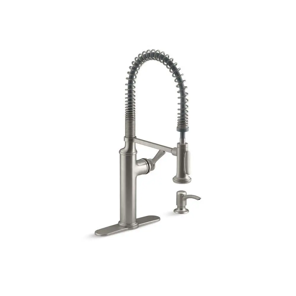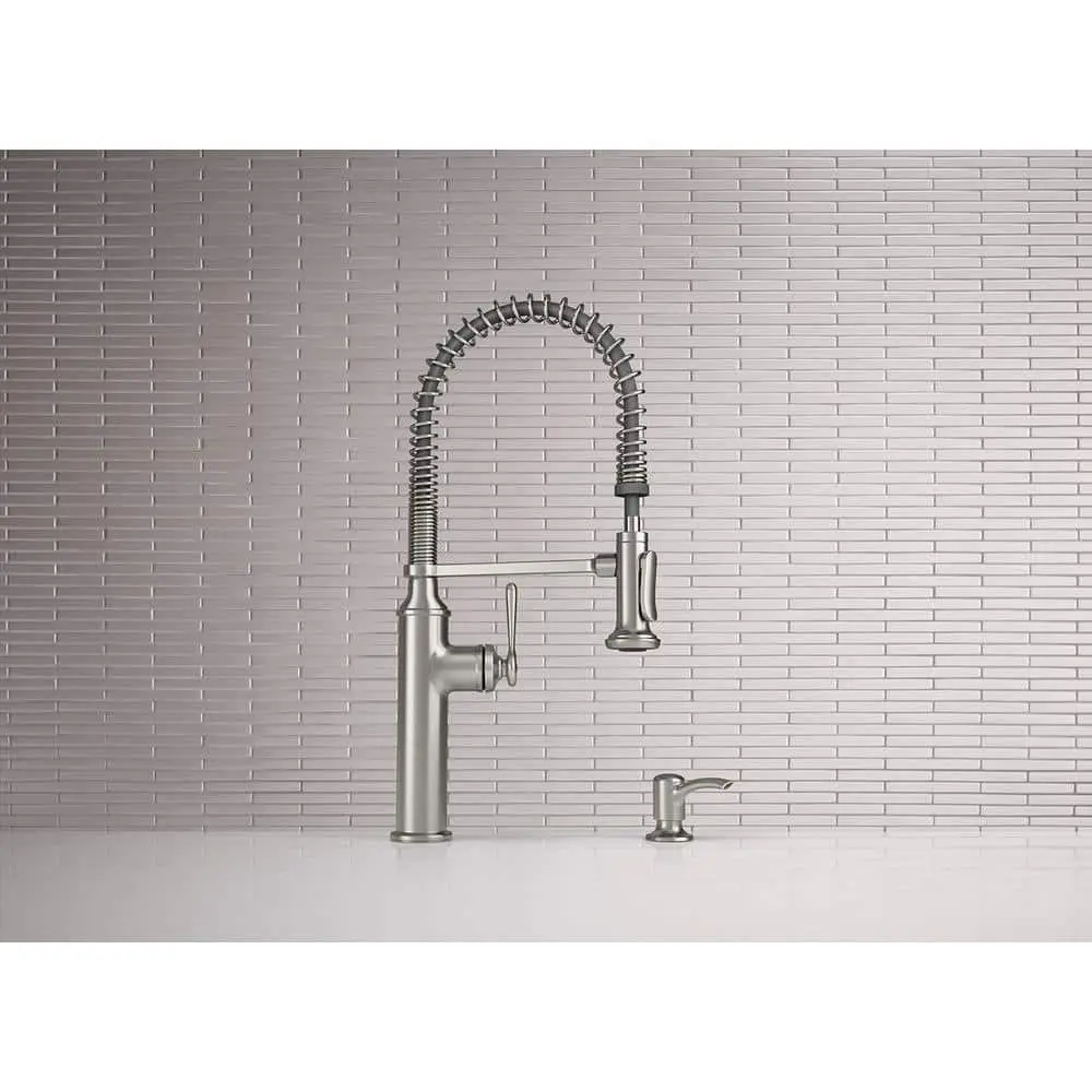 Inspired by professional kitchen designs, the Sous pull-out kitchen faucet is perfect for bringing out your inner chef. It comes with an assembled faucet, 29-1/2-inch supply lines, a soap/lotion dispenser, and a deck plate. The high-arc spout and distinctive exposed-spring design offer outstanding control and flexibility.