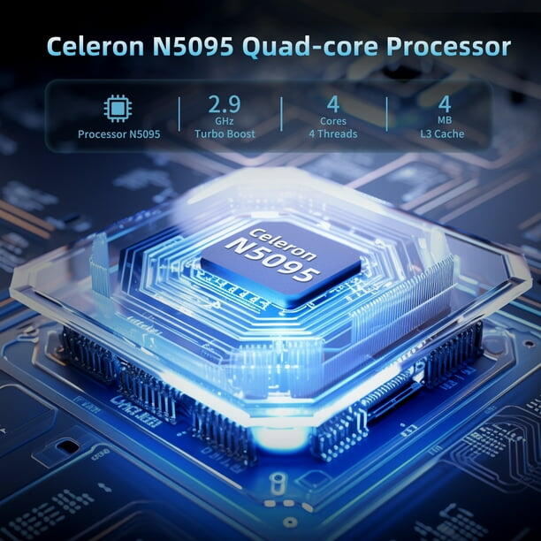 • Processor: Intel Celeron N5095, 4 cores / 4 threads, up to 2.9 GHz, 4MB cache