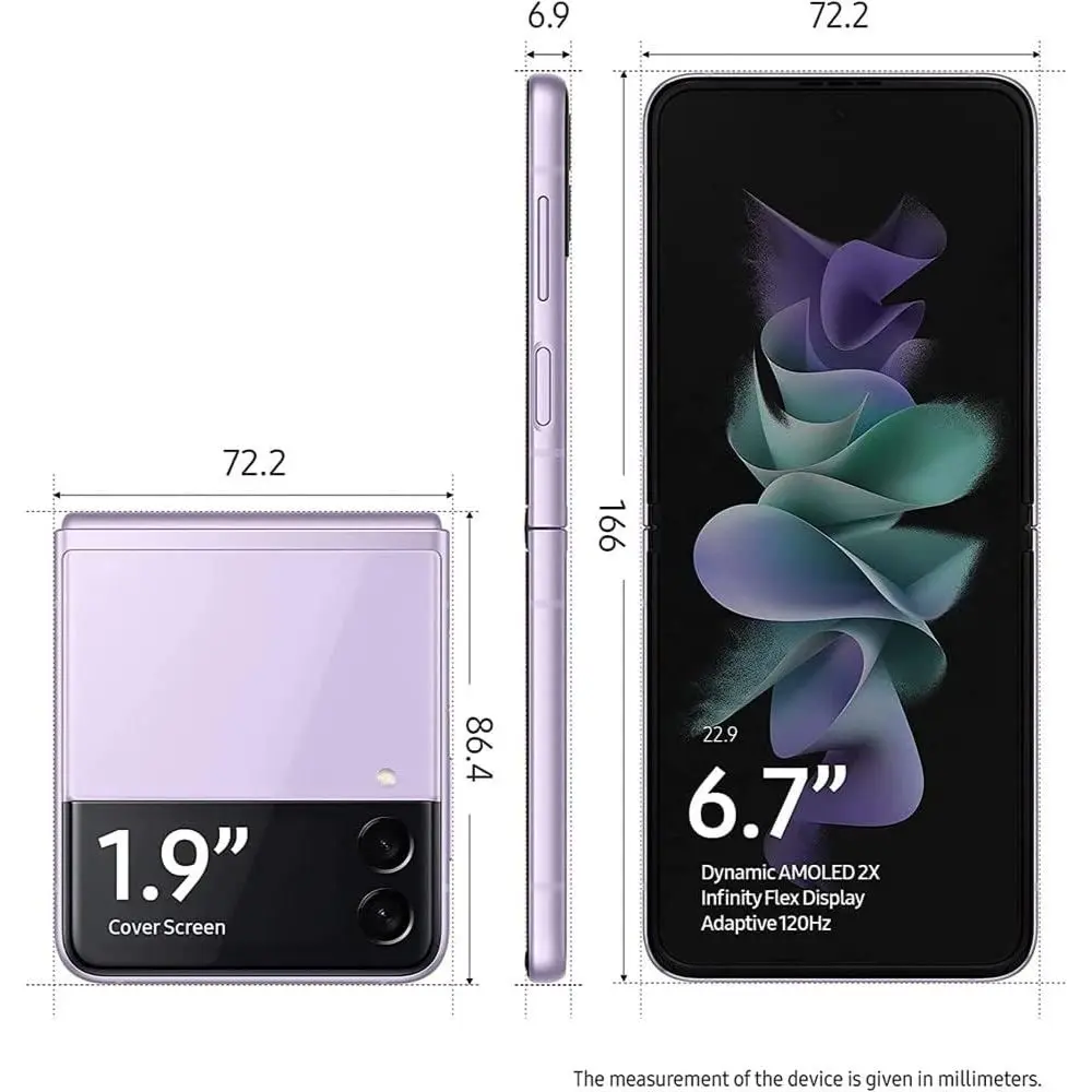 The Samsung Galaxy Z Flip3 5G in Lavender delivers a unique blend of style and performance in a compact, foldable design. Its 6.7-inch AMOLED display folds neatly in half, making it easy to carry while still offering an expansive screen experience with vibrant colors and a smooth 120Hz refresh rate. Powered by the Snapdragon 888 processor and equipped with 8GB of RAM, this device handles multitasking and demanding apps with ease. Fully unlocked, the Galaxy Z Flip3 5G supports 5G VoLTE, ensuring compatibility with most major U.S. carriers for seamless connectivity. This renewed model has been carefully inspected and tested, providing quality performance and style at an excellent value.