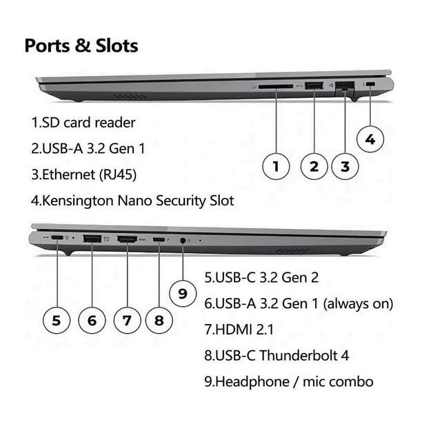 - Multiple ports including USB 3.2 Gen 1, USB-C, Thunderbolt 4, HDMI 2.1, RJ-45 Ethernet, SD card reader, and 3.5mm audio jack