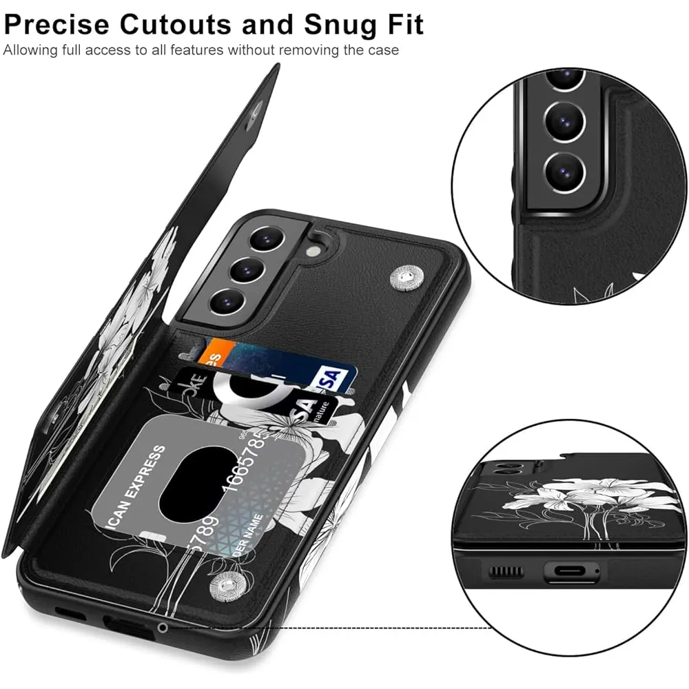 LETO Galaxy S22 Case,Luxury Flip Folio Leather Wallet Case Cover 6.1" White Florals