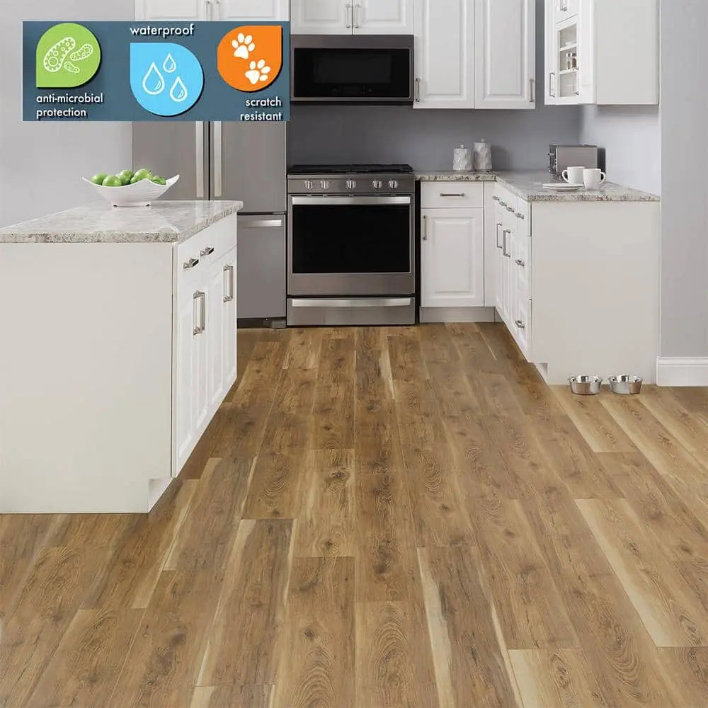 The Lifeproof Sundance Canyon Hickory Waterproof Luxury Vinyl Plank Flooring offers a realistic rustic wood appearance with its Sundance Canyon Hickory finish. Designed for moisture-prone areas, it features a 22 MIL wear layer for durability and long-lasting protection. The click lock installation system ensures a hassle-free, glue-free setup, making it perfect for DIY projects. Each case covers 19.05 sq. ft., with planks measuring 7.1 in. W x 48 in. L, providing ample coverage for your flooring needs